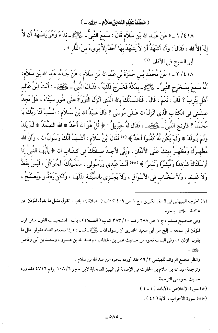 418/ 2 - "عَنْ مُحَمَّد بْنِ حَمْزَةَ بْنِ عَبْدِ الله بْنِ سَلَامٍ، عَنْ جَدِّهِ عَبْدِ الله بْنِ سَلَام: أَنَّهُ سَمِعَ بِمَخْرِجِ النَّبِىِّ - صلى الله عليه وسلم - بِمَكَّةَ فَخَرَجَ فَلَقِيَهُ، فَقَالَ النَّبِىُّ - صلى الله عليه وسلم -: أَنْتَ ابْنُ عَالِم أَهْلِ يَثْرِبَ؟ قَالَ: نَعَمْ، قَالَ: فَنَاشَدْتُكَ بِالله الَّذِى أَنْزَلَ التَّوْرَاةَ عَلَى طُورِ سَيْنَاءَ، هَلْ تَجِدُ صِفَتِى فِى الْكِتَاب الَّذِى أَنْزَلَ الله عَلَى مُوسَى؟ قَالَ عَبْدُ الله بْنُ سَلَامٍ: انْسُبْ لَنَا رَبَّكَ يَا مُحَمَّدُ؟ فأرتج النَّبِىُّ - صلى الله عليه وسلم -، فَقَالَ لَهُ جِبْرِيلُ: {قُلْ هُوَ اللَّهُ أَحَدٌ (1) اللَّهُ الصَّمَدُ (2) لَمْ يَلِدْ وَلَمْ يُولَدْ (3) وَلَمْ يَكُنْ لَهُ كُفُوًا أَحَدٌ} (*) فَقَالَ ابْنُ سَلَامٍ: أَشْهَدُ أَنَّكَ رَسُولُ الله، وَأَنَّ الله مُظهِرُكَ وَمُظهِرُ دِينِكَ عَلَى الأَدْيَانِ، وَإنِّى لأجِدُ صِفَتَكَ فِى كِتَابِ الله {يَاأَيُّهَا النَّبِيُّ إِنَّا أَرْسَلْنَاكَ شَاهِدًا وَمُبَشِّرًا وَنَذِيرًا} (* *) أَنْتَ عَبْدِى وَرَسُولِى، سَمَّيْتُكَ الْمُتَوَكِّلَ، لَيْسَ بِفَظٍّ وَلَا غَلِيظٍ، وَلَا سَخَّابٍ فِى الأَسْوَاقِ، وَلَا يَجْزِى بِالسَّيِّئَةِ مِثْلَهَا، وَلَكِنْ يَعْفُو وَيَصْفَحُ،