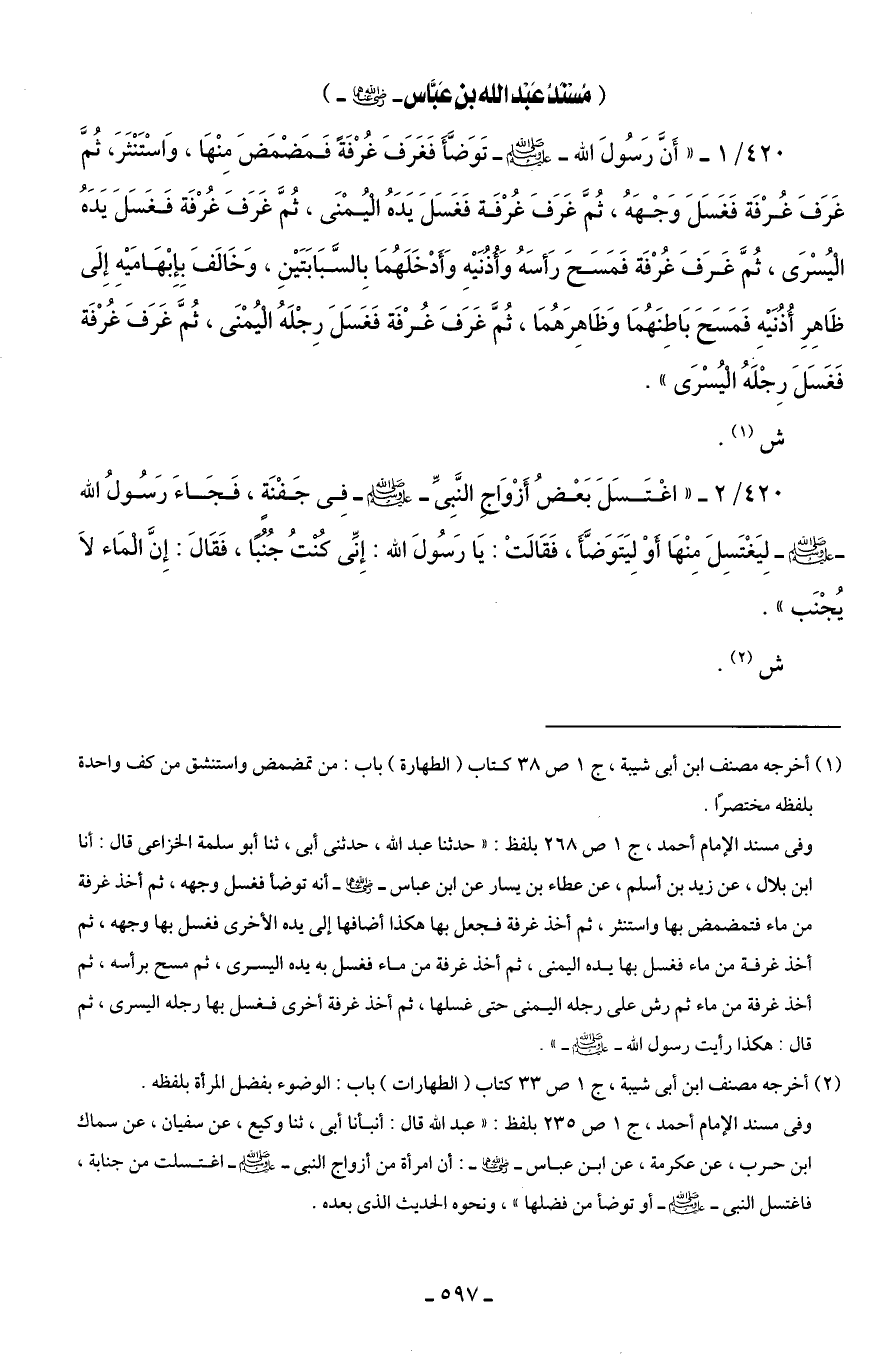 وفى مسند الإمام أحمد، ج 1 ص 268 بلفظ: "حدثنا عبد الله، حدثنى أبى، ثنا أبو سلمة الخزاعى قال: أنا ابن بلال، عن زيد بن أسلم، عن عطاء بن يسار عن ابن عباس - رضي الله عنهما - أنه توضأ فغسل وجهه، ثم أخذ غرفة من ماء فتمضمض بها واستنثر، ثم أخذ غرفة فجعل بها هكذا أبيافها إلى يده الأخرى فغسل بها وجهه، ثم أخذ غرفة من ماء فغسل بها يده اليمنى، ثم أخذ غرفة من ماء فغسل به يده اليسرى، ثم مسح برأسه، ثم أخذ غرفة من ماء ثم رش على رجله اليمنى حتى غسلها، ثم أخذ غرفة أخرى فغسل بها رجله اليسرى، ثم قال: هكذا رأيت رسول الله - صلى الله عليه وسلم - ".