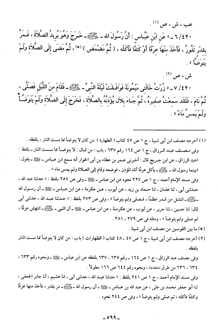 420/ 6 - "عَنِ ابْنِ عَبَّاسٍ: أَنَّ رَسُولَ الله - صلى الله عليه وسلم - خَرَجَ وَهُوَ يُرِيدُ الصَّلَاةَ، فَمَرَّ بِقِدْرٍ تَفُورُ، فَأَخَذَ مِنْهَا عِرْفًا أَوْ كَتفًا فَأَكَلَه، (ثُمَّ مَضْمَض) (*)، ثُمَّ مَضَى إِلَى الصَّلَاةِ وَلَمْ يَتَوَضَّأ".