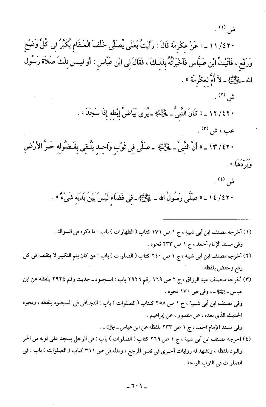 420/ 11 - "عَنْ عِكْرِمَة قَالَ: رَأَيْتُ يَعْلَى يُصَلِّى خَلفَ الْمَقَامِ يُكبِّرُ فِى كُلِّ وَضَعٍ وَرَفْعٍ، فَأَتَيْتُ ابْن عَبَّاس فَأَخْبَرْتُهُ بِذَلِكَ، فَقَالَ لِى ابْن عَبَّاسٍ: أَو ليس تِلكَ صَلَاة رَسُول الله - صلى الله عليه وسلم - لَا أُمَّ لِعِكْرِمَة".