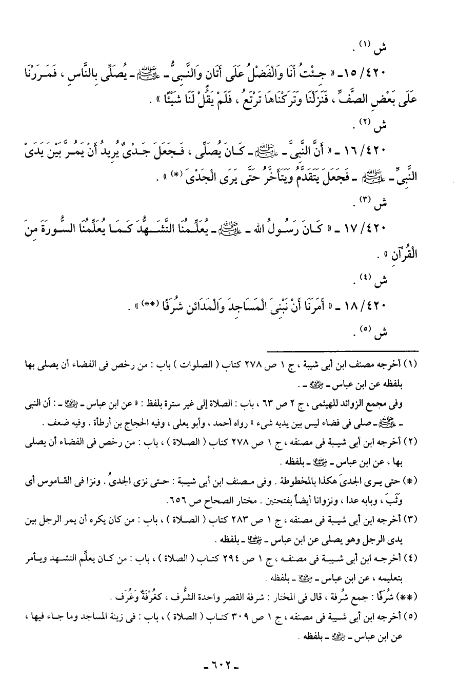 420/ 15 - "جِئْتُ أَنَا وَالْفَضْلُ عَلَى أَتَانٍ وَالنَّبِىُّ - صلى الله عليه وسلم - يُصَلِّى بِالنَّاسِ، فَمَرَرْنَا عَلَى بَعْضِ الصَّفِّ، فَنَزَلْنَا وَتَرَكْنَاهَا تَرْتَعُ، فَلَمْ يَقُلْ لَنَا شَيْئًا".