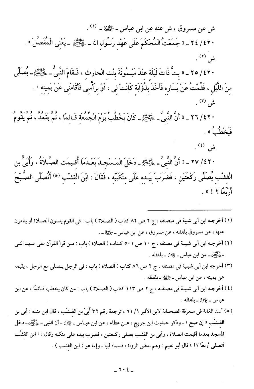 420/ 27 - "أَنَّ النَّبِىَّ - صلى الله عليه وسلم - دَخَلَ الْمَسْجِدَ بَعْدَمَا أُقيمَت الصَّلَاةُ، وَأُبَىُّ بن الْقِشْبِ يُصَلِّى رَكعَتَيْنِ، فَضَرَبَ بِيَدِهِ عَلَى مِنْكَبَيْهِ، فَقَالَ: ابْنَ الْقِشْبِ (*) أَتُصَلِّى الصُّبْحَ أرْبَعًا؟ ! ".