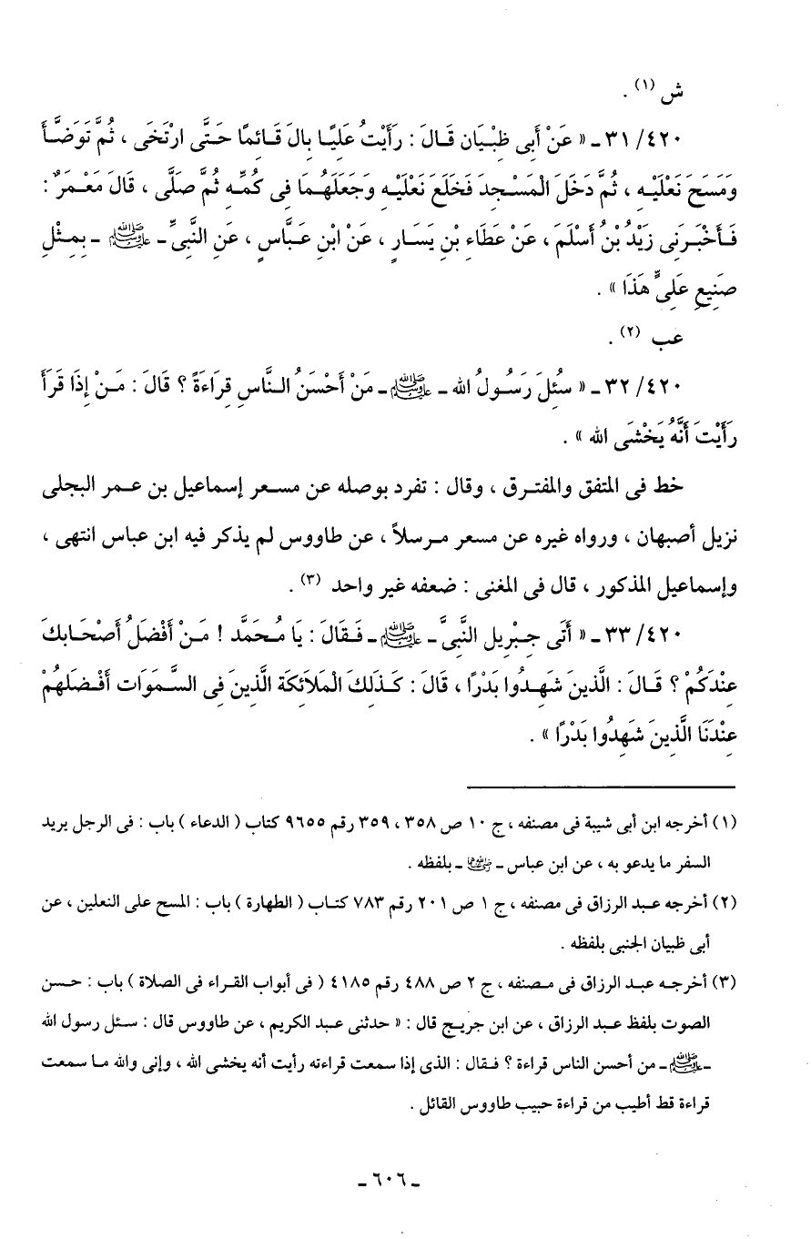 420/ 31 - "عَنْ أَبِى ظِبْيَان قَالَ: رَأَيْتُ عَلِيًا بِالَ قَائِمًا حَتَّى ارْتَخَى، ثُمَّ تَوَضَّأَ وَمَسَحَ نَعْلَيْهِ، ثُتمَ دَخَلَ الْمَسْجِدَ فَخَلَعَ نَعْلَيْهِ وَجَعَلَكمَا فِى كمِّهِ ثُمَّ صَلَّى، قَالَ مَعْمَرٌ: فَأَخْبَرَنِى زَيْدُ بْنُ أَسْلَمَ، عَنْ عَطَاءِ بْنِ يَسَارٍ، عَنْ ابْنِ عَبَّاسٍ، عَنِ النَّبِىِّ - صلى الله عليه وسلم - بِمِثْلِ صَنِيع عَلِىٍّ هَذَا".