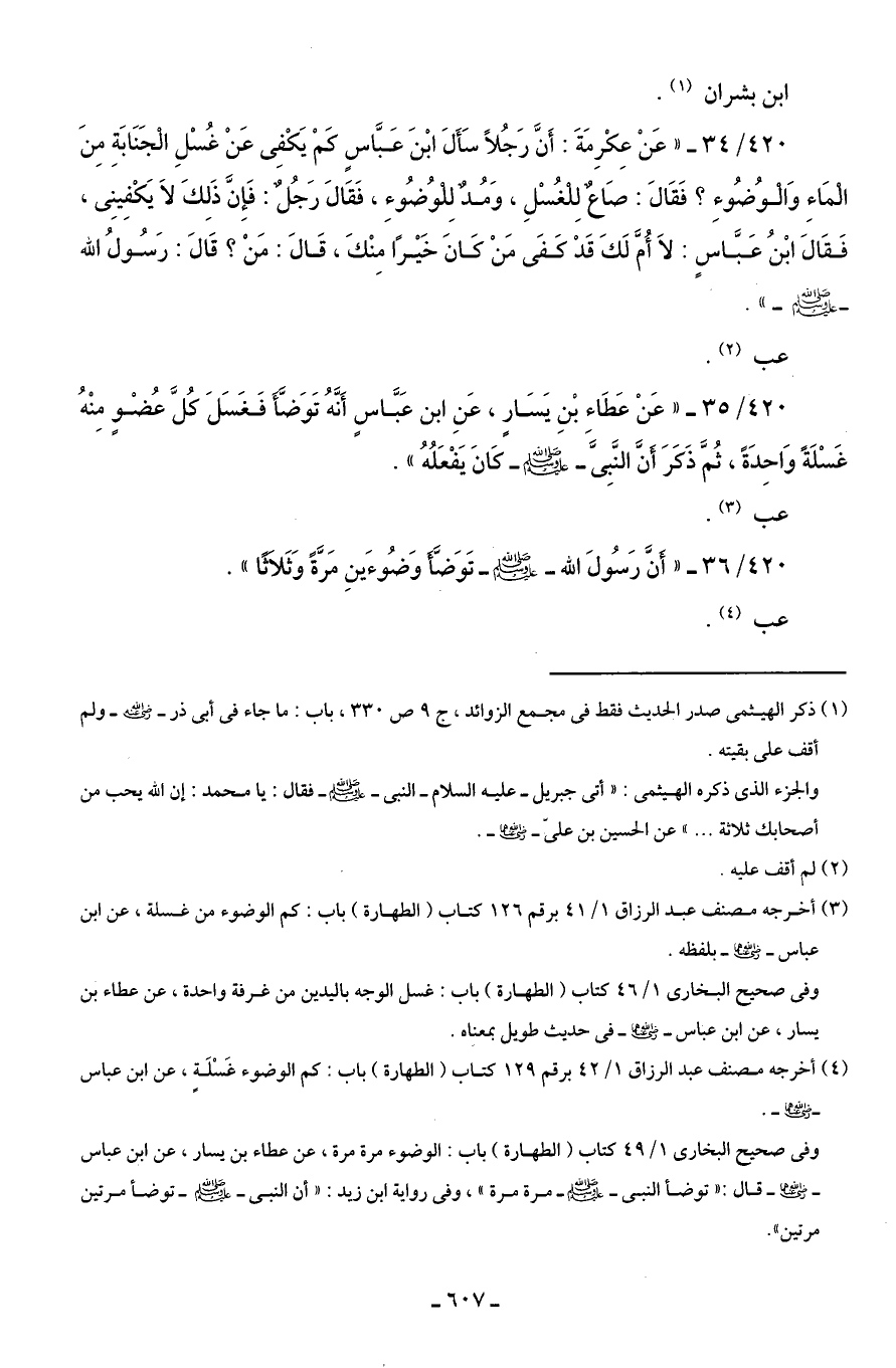 420/ 35 - "عَنْ عَطَاء بْنِ يَسَارٍ، عَنِ ابن عَبَّاسٍ أَنَّهُ تَوَضَّأَ فَغَسَلَ كُلَّ عُضْوٍ مِنْهُ غَسْلَةً وَاحِدَةً، ثُمَّ ذَكَرَ أَنَّ النَّبِىَّ - صلى الله عليه وسلم - كانَ يَفْعَلُهُ".