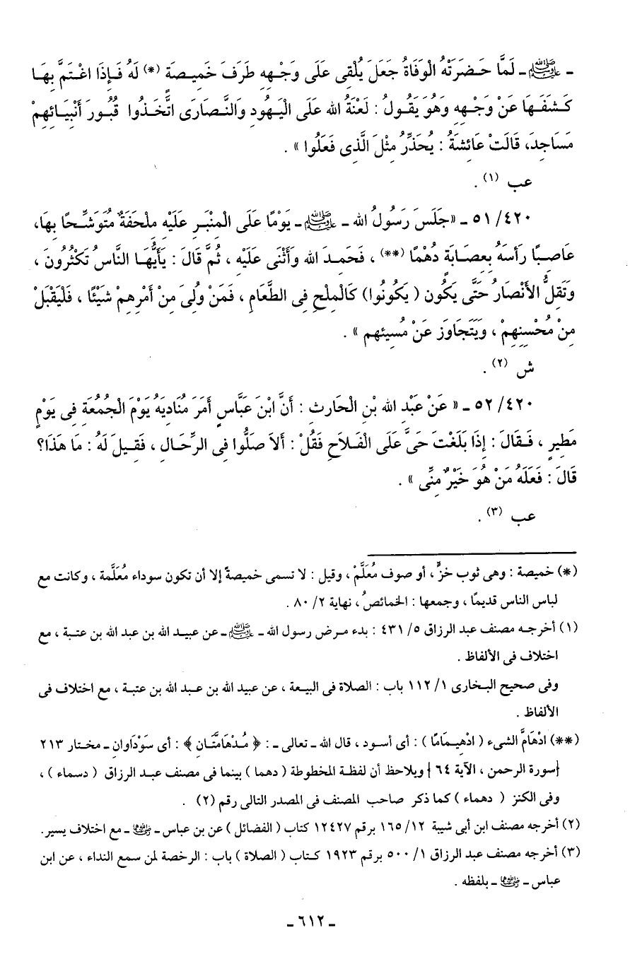 420/ 51 - "جَلَسَ رَسُولُ الله - صلى الله عليه وسلم - يَوْمًا عَلَى الْمِنْبَرِ عَلَيْهِ ملحَفَةٌ مُتَوَشِّحًا بِهَا، عَاصبًا رَأسَهُ بِعِصَابَة دُهْمًا (* *)، فَحَمدَ الله وَأَثْنَى عَلَيْهِ، ثُمَّ قَالَ: يَأَيُّهَا النَّاسُ تَكْثُرُونَ، وَتَقِلُّ الأنْصَارُ حَتَّى يَكُون (يَكُونُوا) كَالْمِلحِ فِى الطَّعَامِ، فَمَنْ ولُىَ مِنْ أَمْرِهِمْ شَيْئًا، فَليَقْبَلْ مِنْ مُحْسِنِهِمْ، وَيَتَجَاوَز عَنْ مُسِيئهم".