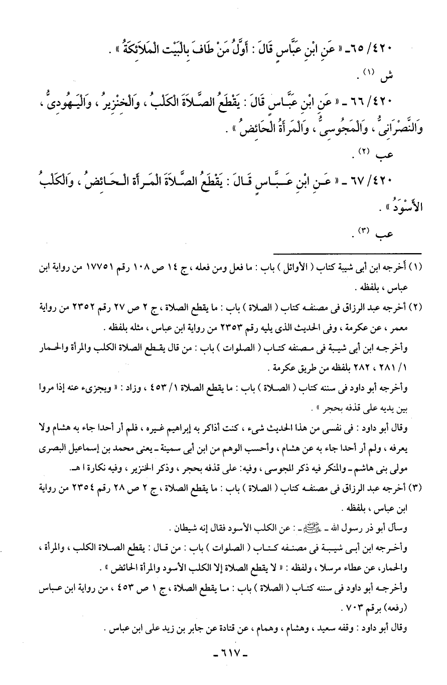420/ 66 - "عَنِ ابْنِ عَبَّاسٍ قَالَ: يَقْطَعُ الصَّلَاةَ الْكَلْبُ، وَالْخِنْزِيرُ، وَالْيَهُودِىُّ، وَالنَّصْرَانِىُّ، وَالْمَجُوسِىُّ، وَالْمَرأَةُ الْحَائِضُ".