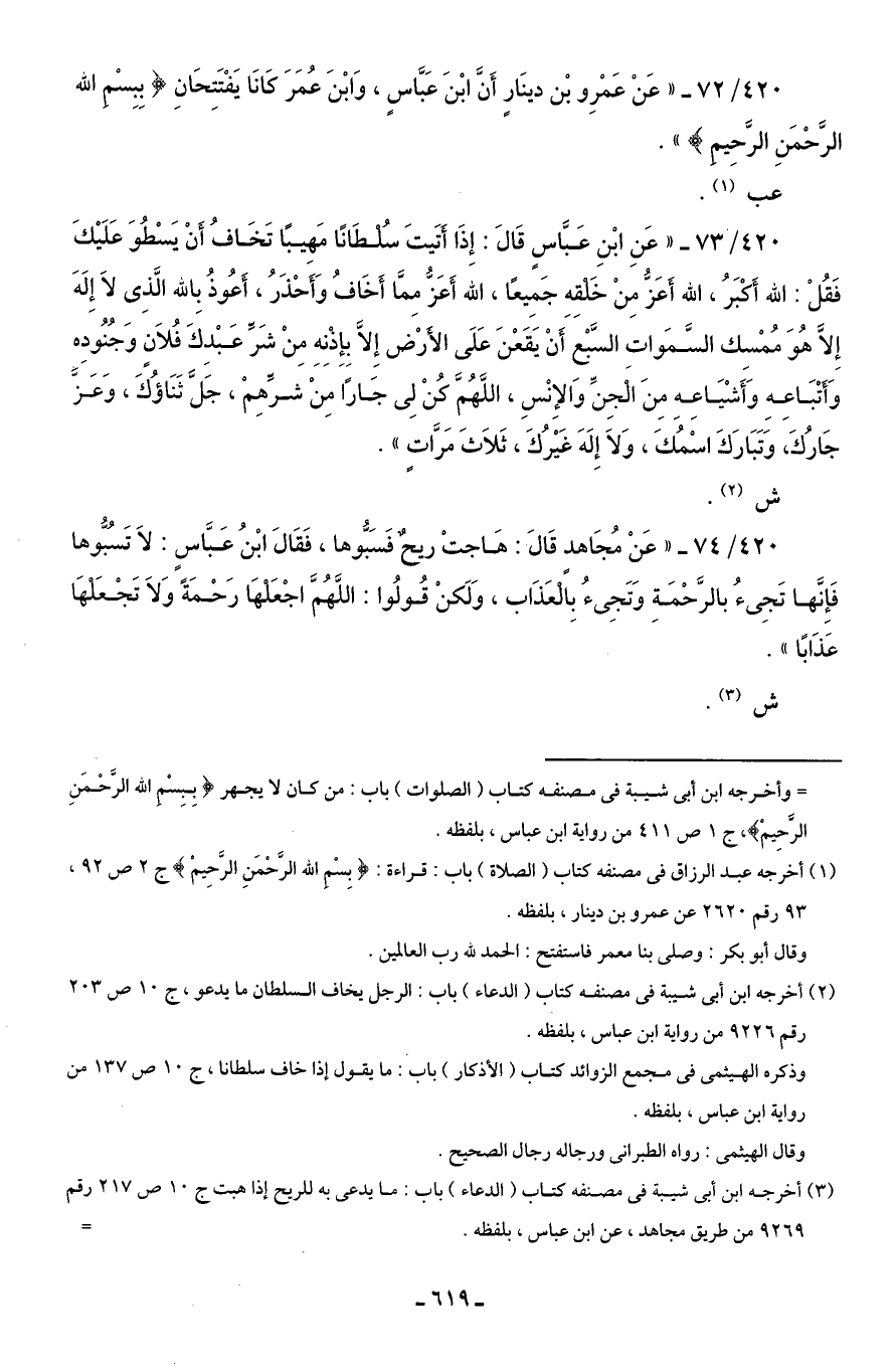 420/ 72 - "عَنْ عَمْرِو بْن دينَارٍ أَنَّ ابْنَ عَبَّاس، وَابْنَ عُمَرَ كَانَا يَفْتَتِحَانِ {بِسْمِ اللَّهِ الرَّحْمَنِ الرَّحِيمِ} ".