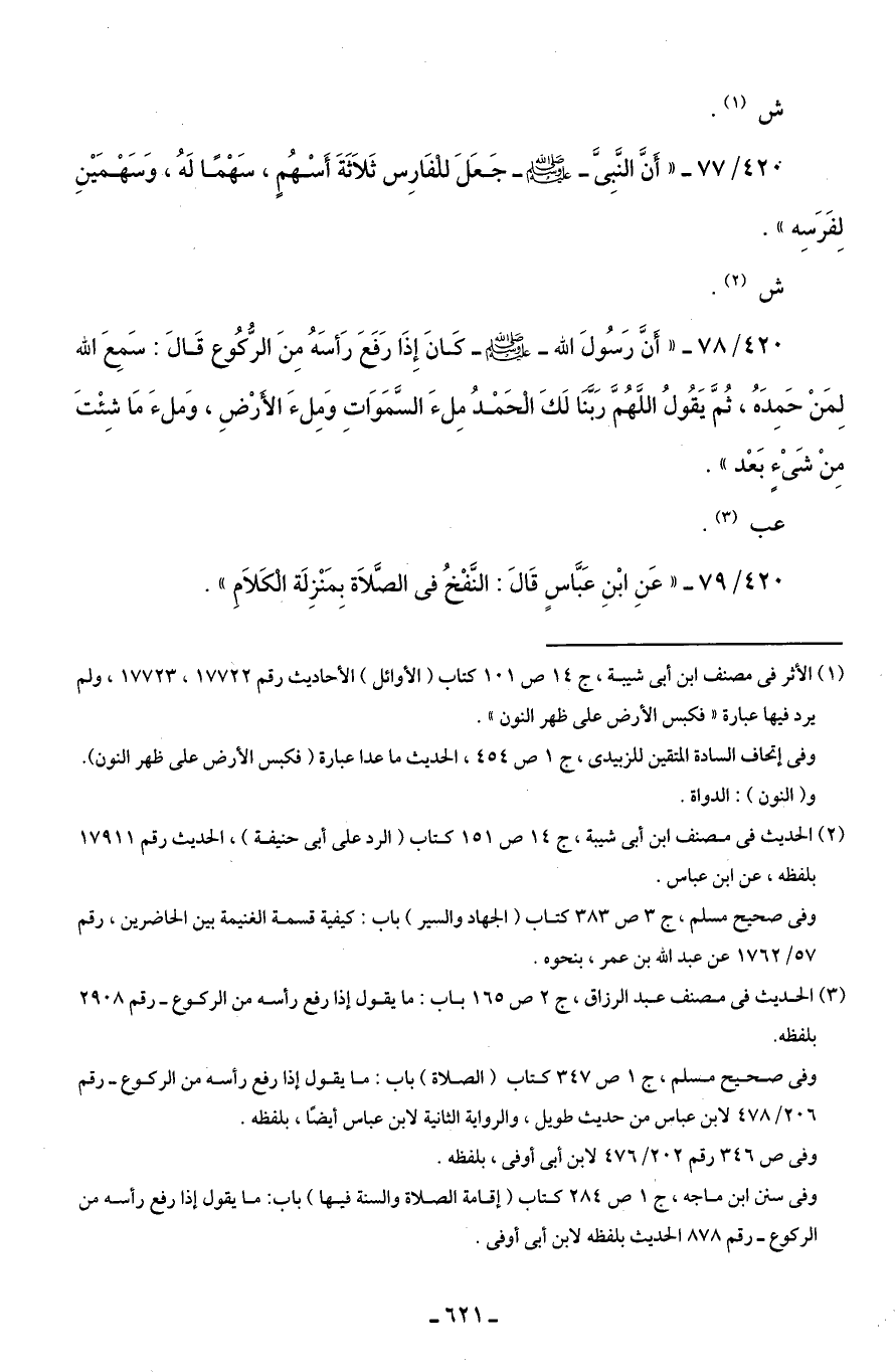420/ 77 - "أَنَّ النَّبِيَّ - صلى الله عليه وسلم - جَعَلَ للفَارِس ثَلَاثَةَ أَسْهُمٍ، سَهْمًا لَهُ، وَسَهْمَيْنِ لِفَرَسِهِ".