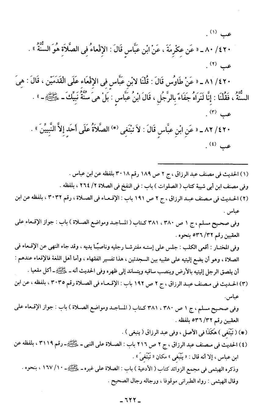 420/ 81 - "عَنْ طَاوسُ قَالَ: قُلنَا لابْنِ عَبَّاسٍ فِى الإِقْعَاءِ عَلَى الْقَدَمَيْن، قَالَ: هِىَ السُّنَّةُ، فَقُلنَا: إِنَّا لَنَرَاهُ جَفَاءً بِالرَّجُلِ، قَالَ ابْنُ عَبَّاسٍ: بَلْ هىَ سُنَّةُ نَبِيِّكَ - صلى الله عليه وسلم - ".