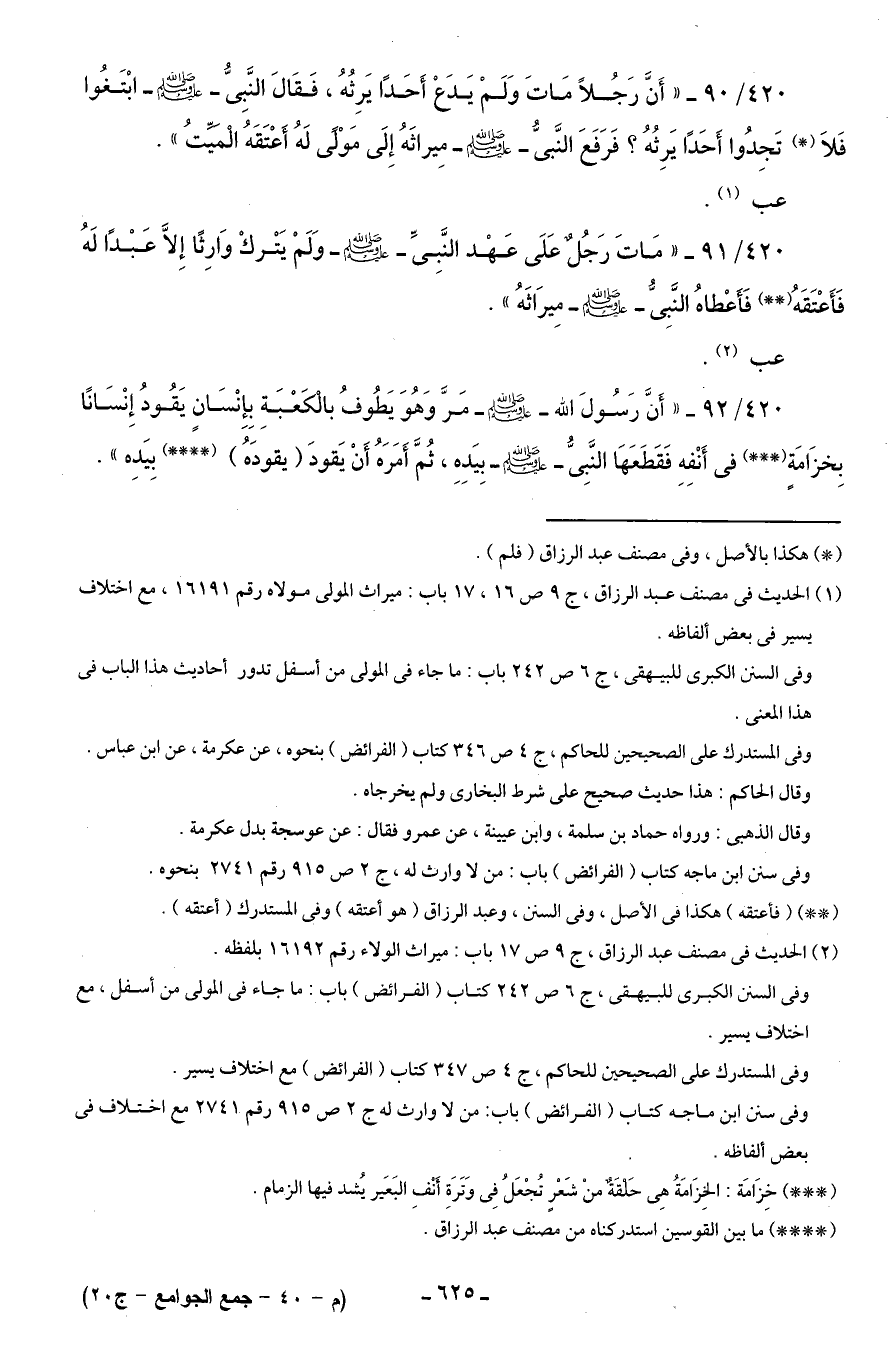 420/ 91 - "مَاتَ رَجُلٌ عَلَى عَهْد النَّبِىِّ - صلى الله عليه وسلم - وَلَمْ يَتْركْ وَارِثًا إِلَّا عَبْدًا لَهُ فَأَعْتَقَهُ (* *) فَأَعْطاهُ النَّبِىُّ - صلى الله عليه وسلم - مِيرَاثَهُ".