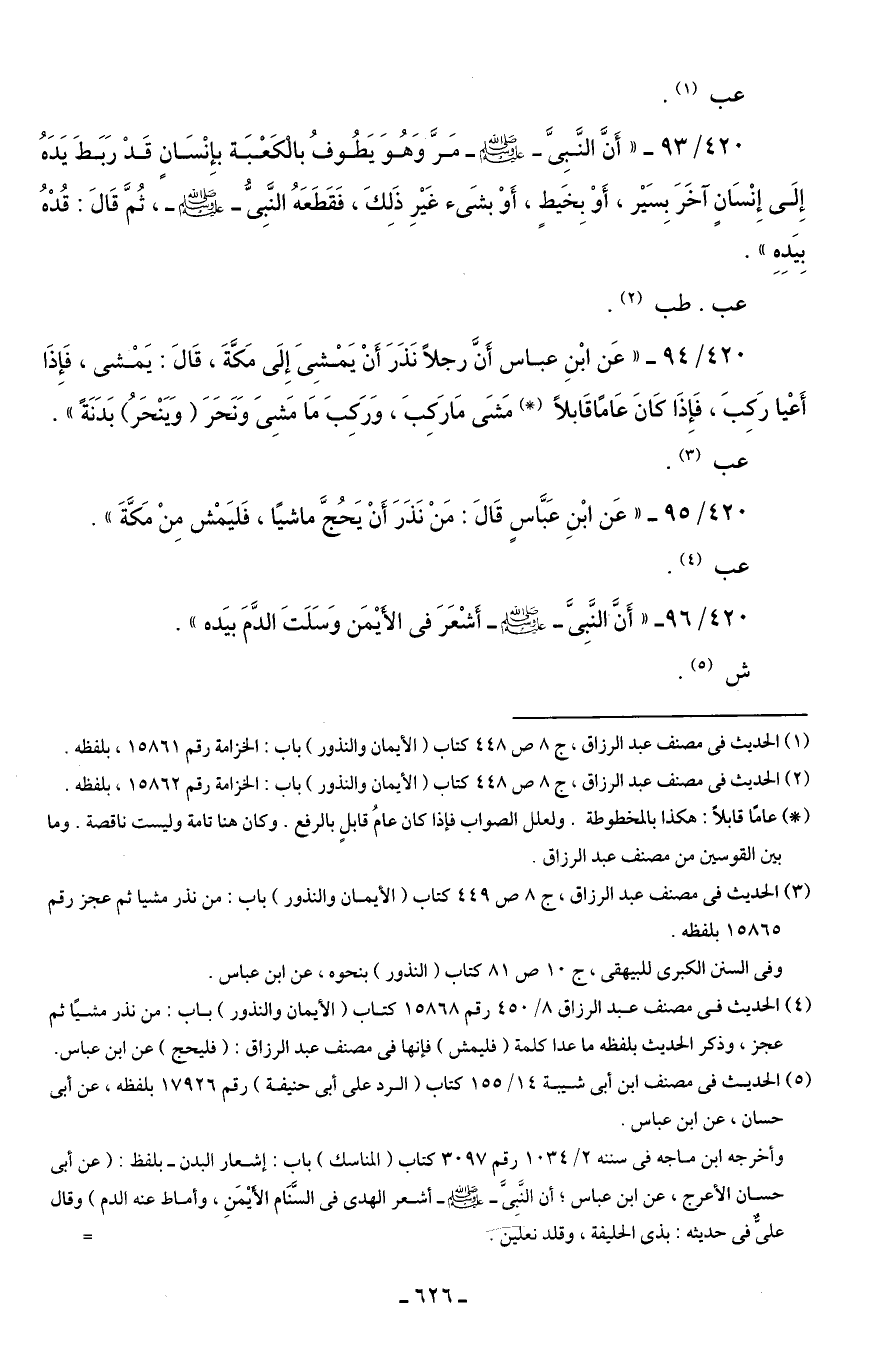 420/ 94 - "عَن ابْنِ عباس أَنَّ رجلًا نَذَرَ أَنْ يَمْشِىَ إِلَى مَكَّةَ، قَالَ: يَمْشى، فَإِذَا أَعْيا رَكِبَ، فَإِذَا كَانَ عَامًا قَابلًا (في) مَشَى مَا رَكِبَ، وَرَكِبَ مَا مَشِىَ وَنَحَرَ (وَيَنْحَرُ) بَدَنَةً".