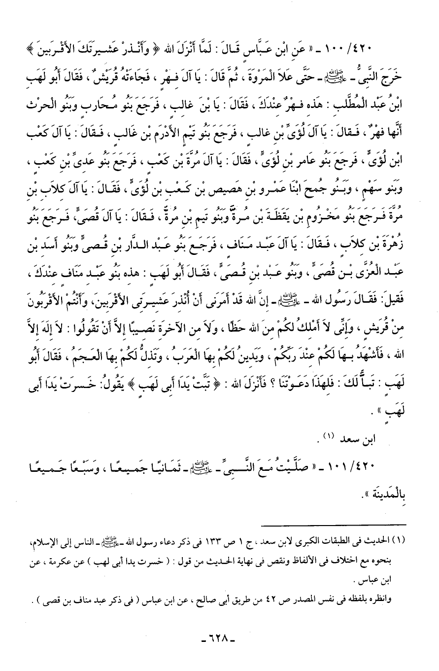 420/ 100 - "عَنِ ابْن عَبَّاسٍ قَالَ: لَمَّا أَنْزَلَ الله {وَأَنْذرْ عَشِيرَتَكَ الأَقْرَبينَ} خَرَجَ النَّبِىُّ - صلى الله عليه وسلم - حَتَّى عَلَا الْمَرْوَةَ، ثُمَّ قَالَ: يَا آلَ فِهْرٍ، فَجَاءَتْهُ قُرَيْشٌ، فَقَالَ أَبُو لَهَبِ ابْنُ عَبْد الْمُطلبِ: هَذهِ فهْرٌ عِنْدَكَ، فَقَالَ: يَا بْنَ غالِبِ، فَرَجَعَ بَنُو مُحَاربٍ وَبَنُو الْحرْث أَنَها فهْرٌ، فَقالَ: يَا آلَ لُؤَىَ بْنِ غالبٍ، فَرَجَعَ بَنُو تَيْمٍ الأَدْرَم بْن غَالبٍ، فَقَالَ: يَا آلَ كَعْب ابْن لُؤَىٍّ، فَرجَعَ بَنُو عَامر بْنِ لُؤَىٍّ، فَقَالَ: يَا آلَ مُرة بْن كَعْبٍ، فَرَجَعَ بَنُو عَدِىِّ بْنِ كَعْبٍ، وَبَنو سَهْمٍ، وَبَنُو جُمحَ ابْنَا عَمْرو بْنِ هَصيص بْن كَعْبِ بْن لُؤَىٍّ، فَقَالَ: يَا آلَ كِلَابِ بْنِ مُرَّةَ فَرَجَعَ بَنُو مَخْزُومِ بْن يَقَظَةَ بْن مُرةَّ وَبَنُو تَيم بْنِ مُرَّةَ، فَقَالَ: يَا آلَ قُصَى، فَرَجَعَ بَنُو زهرَةَ بْن كِلَابٍ، فَقَالَ: يَا آلَ عَبْد مَنَاف، فَرَجَعَ بَنُو عَبْد الدَّار بْنِ قُصىٍّ وَبَنُو أَسَدِ بْن عَبْد الْعُزَّى بْن قُصَىٍّ، وَبَنُو عَبْد بْنِ قُصَىٍّ، فَقَالَ أَبُو لَهَبٍ: هذِه بَنُو عَبْدِ مَنَافٍ عِنْدَكَ، فَقيلَ: فَقَالَ رَسُول الله - صلى الله عليه وسلم - إِنَّ الله قَدْ أَمَرَنى أَنْ أَنْذِرَ عَشِيرَتِى الأقْرَبِينَ، وَأَنْتُمْ الأقْرَبُونَ مِنْ قُرَيشٍ، وَإِنِّى لَا أَمْلِكُ لكُمْ مِنَ الله حَظًا، وَلَا مِن الآخرَةِ نَصِيبًا إِلَّا أَنْ تَقُولُوا: لَا إِلَهَ إِلَّا الله، فَأَشْهَدُ بهَا لَكُمْ عِنْدَ ربِّكُمْ، وَيَدِينُ لَكُمْ بِهَا الْعَرَبُ، وَتَذِلُّ لَكُمْ بِهَا الْعَجَمُ، فَقَالَ أَبُو لَهَبٍ: تَبًّا لَكَ: فَلِهَذَا دَعَوْتَنَا؟ فَأَنْزَلَ الله: {تَبَّتْ يَدَا أَبِى لَهَبٍ} يَقُولُ: خَسرَتْ يَدَا أَبى لَهَبٍ".