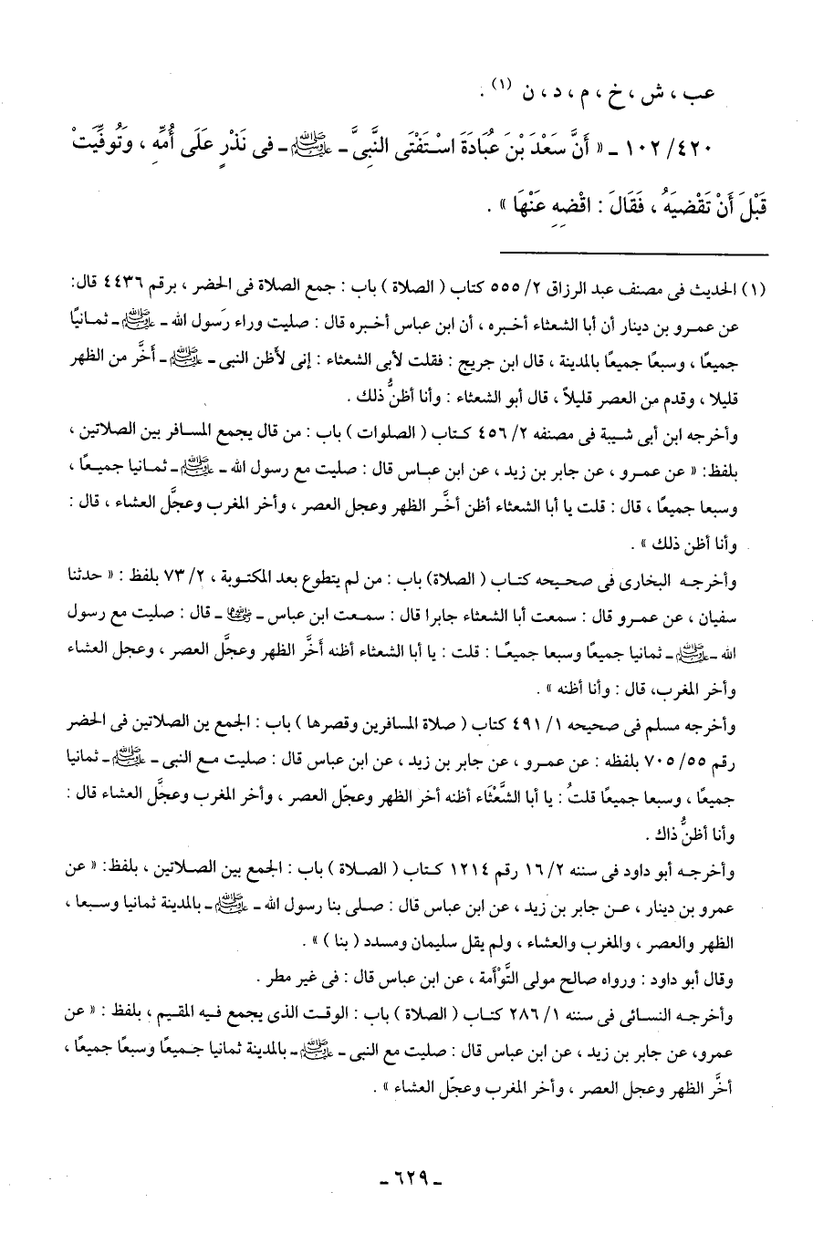 420/ 102 - "أَنَّ سَعْدَ بْنَ عُبَادَةَ اسْتَفْتَى النَّبِىَّ - صلى الله عليه وسلم - في نَذْرٍ عَلَى أُمِّهِ، وَتُوفِّيَتْ قَبْلَ أَنْ تَقْضيَهُ، فَقَالَ: اقْضِهِ عَنْهَا".