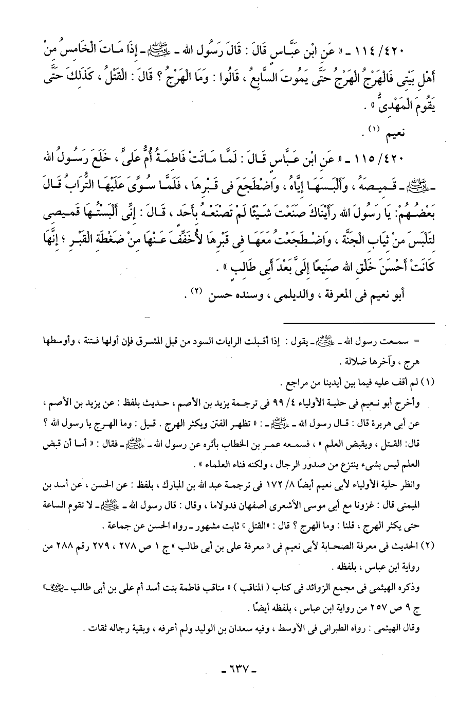 420/ 114 - "عَنِ ابْن عَبَّاسٍ قَالَ: قَالَ رَسُول الله - صلى الله عليه وسلم - إِذَا مَاتَ الْخَامِسُ مِنْ أَهْلِ بَيْتِى فَالْهَرْجُ الْهَرْجُ حَتَّى يَمُوتَ السَّابِعُ، قَالُوا: وَمَا الْهَرْجُ؟ قَالَ: الْقَتْلُ، كذَلِكَ حَتَّى يَقُومَ الْمَهْدِىُّ".