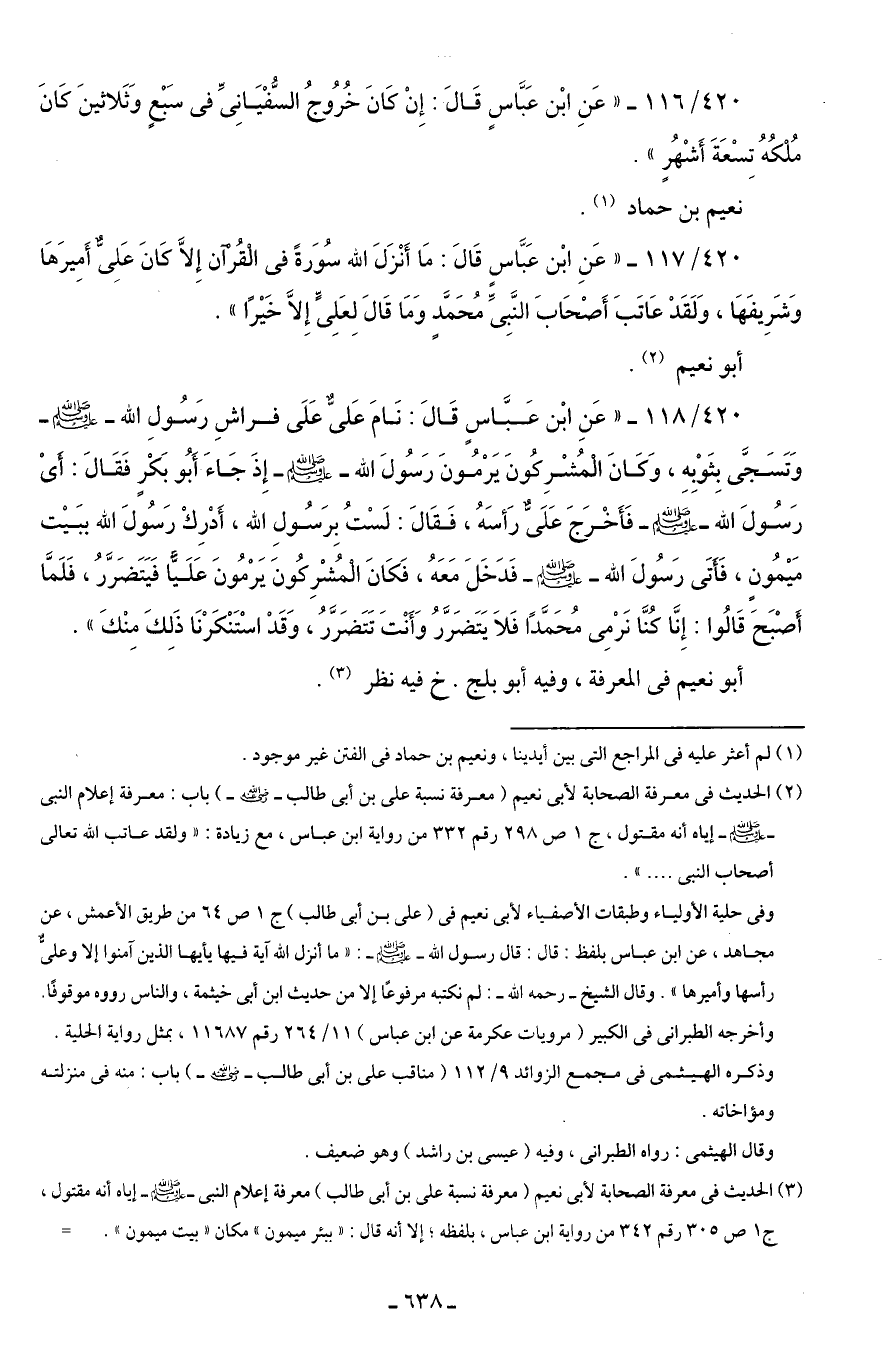 420/ 116 - "عَنِ ابْن عَبَّاسٍ قَالَ: إِنْ كَانَ خُرُوجُ السُّفْيَانِىِّ في سَبْعٍ وَثَلاثينَ كَانَ مُلْكُهُ تِسْعَةَ أَشْهُرٍ".