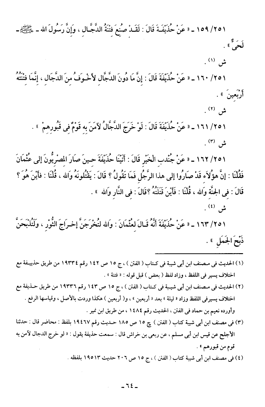 251/ 159 - "عَنْ حُذَيْفَةَ قَالَ: لَقَدْ صُنِعَ فِتْنَةُ الدَّجَّالِ، وَإِنَّ رَسُولَ الله - صلى الله عليه وسلم - لَحَىٌّ".