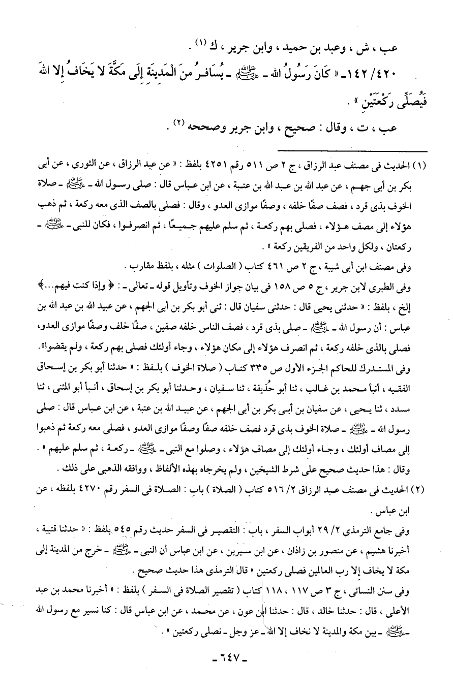 420/ 142 - "كَانَ رَسُولُ الله - صلى الله عليه وسلم - يُسَافرُ منَ الْمَدِينَةِ إِلَى مَكَّةَ لا يَخَافُ إِلَّا اللهَ فَيُصَلِّى رَكْعَتَيْنِ".