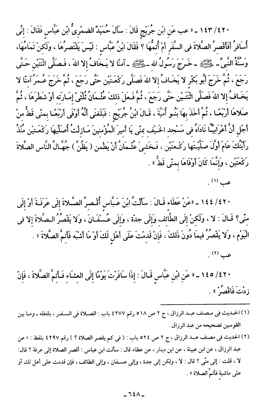 420/ 143 - "عب عَنِ ابْن جُرَيْجٍ قَالَ: سَأَلَ حُمَيْدٌ الضمْرِىُّ ابْن عَبَّاسٍ فَقَالَ: إِنِّى أُسَافرُ أَفَأَقْصِرُ الصَّلاةَ في السَّفَرِ أَمْ أُتِمُّهَا؟ فَقَالَ ابْنُ عَبَّاسٍ: لَيْسَ يَقْتَصرُهَا، وَلَكِنْ تَمَامُهَا، وَسُنَّةُ النَّبِىِّ - صلى الله عليه وسلم - خَرَجَ رَسُولُ اللهِ - صلى الله عليه وسلم - آمنًا لا يَخَافُ إِلا اللهَ، فَصَلَّى اثْنَتَيْنِ حَتَّى رَجَعَ، ثُمَّ خَرَجَ أَبُو بَكْر لا يَخَافُ إَلَّا اللهَ فَصَلَّى رَكْعَتَيْن حَتَّى رَجَعَ، ثُمَّ خَرَجَ عُمَرُ آمِنًا لا يَخَافُ إِلا اللهَ فَصَلَّى اثْنَتَيْن حَتَّى رجَعَ، ثُمَّ فَعَلَ ذلِكَ عثمَانُ ثُلثَىْ إِمَارَتِهِ أَوْ شَطرَهَا، ثُمَّ صَلاهَا أَرْبَعًا، ثُمَّ أَخَذَ بِهَا بَنُو أُمَيَّةَ، قَالَ ابْنُ جُرَيْجٍ: فَبَلَغنَى أَنَّهُ أَوْفَى أَرْبَعًا بِمنًى قَط منْ أجْلِ أنَّ أَعْرَابِيًّا نَادَاهُ فِى مَسْجدِ الخَيْفِ بمِنًى يَا أَمِيرَ الْمُؤْمنِينَ مَازِلْتُ أُصَلِّيهَا رَكْعَتيْن مُنْذُ رَأَيْتُكَ عَامَ أَوَّلَ صَلَّيْتَها رَكعَتَيْن، فَخَشِىَ عُثمَانُ أَنْ يَطْمن (يَظُنَّ) جُهَّالُ النَّاس الصَّلاةَ رَكْعَتَيْن، وَإنَّمَا كَانَ أَوْفَاهَا بِمنًى قَطُّ".