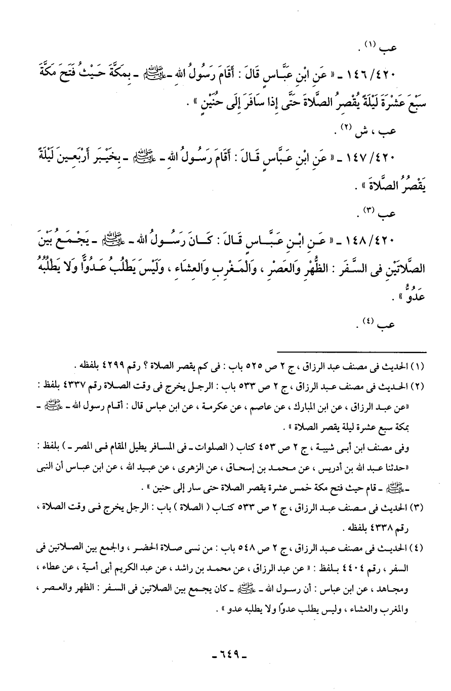 420/ 146 - "عَنِ ابْنِ عَبَّاسٍ قَالَ: أَقَامَ رَسُولُ اللهِ - صلى الله عليه وسلم - بِمَكَّةَ حَيْثُ فَتَحَ مَكَّةَ سَبْعَ عَشْرَةَ لَيْلَةً يُقْصِرُ الصَّلاةَ حَتَّى إِذا سَافَرَ إِلَى حُنَيْنٍ".