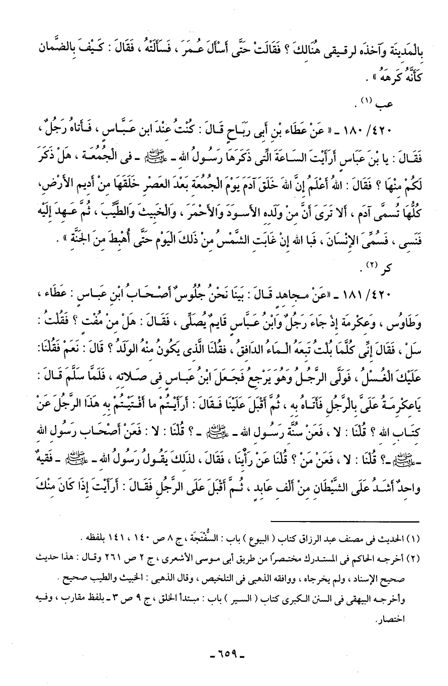420/ 181 - "عَنْ مجِاهدٍ قَالَ: بَينَا نَحْنُ جُلُوس أَصْحَابُ ابْنِ عَباسٍ: عَطَاء، وَطَاوُس، وَعكْرمَة إِذ جَاءَ رَجُل وَابْنُ عَبَّاسٍ قَايمٌ يُصَلِّى، فَقَالَ: هَلْ مِنْ مُفْتٍ؟ فَقُلتُ: سَلْ، فَقَالَ إِنِّى كُلَّمَا بُلتُ تَبِعَهُ الْمَاءُ الدَافِقُ، فقُلنَا الَّذِى يَكُونُ مِنْهُ الوَلَدُ؟ قَالَ: نَعَمْ فَقُلنَا: عَلَيْكَ الْغُسْلُ، فَوَلَّى الرَّجُلُ وَهُوَ يَرْجِعُ فَجَعَلَ ابْنُ عَباسٍ فِى صَلاتِهِ، فَلَمَّا سَلَّمَ قَالَ: يَا عِكْرِمَةُ عَلَىَّ بِالْرَّجُلِ فَأَتَاهُ بِه، ثُمَّ أَقْبَلَ عَلَيْنَا فَقَالَ: أرَأَيْتُمْ ما أَفْتَيْتُمْ بِهِ هَذَا الرَّجُلَ عَنْ كتَابِ اللهِ؟ قُلنَا: لا، فَعَنْ سُنَّةِ رَسُولِ الله - صلى الله عليه وسلم -؟ قُلنَا: لا: فَعَنْ أَصْحَاب رَسُولِ اللهِ - صلى الله عليه وسلم -؟ قُلْنَا: لا، فَعَنْ مَنْ؟ قُلنَا عَنْ رَأْيِنَا، فَقَالَ، لذَلِكَ يَقُولُ رَسُولُ اللهِ - صلى الله عليه وسلم - فَقيهٌ واحِدٌ أَشَدُ عَلَى الشَّيْطَانِ مِنْ أَلْفِ عَابِدٍ، ثُمَّ أَقْبَلَ عَلَى الرَّجُلِ فَقَالَ: أَرَأَيْتَ إِذَا كَانَ مِنْكَ