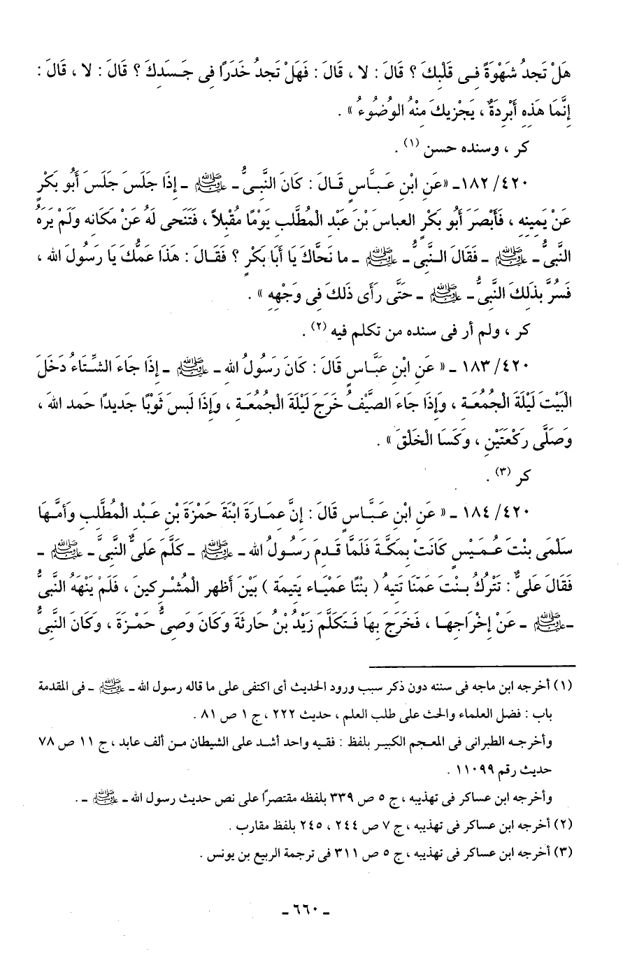 420/ 182 - "عَنِ ابْنِ عَبَّاسٍ قَالَ: كَانَ النَّبِىُّ - صلى الله عليه وسلم - إِذَا جَلَسَ جَلَسَ أَبُو بَكْرٍ عَنْ يَمِينِه، فَأَبْصَرَ أَبُو بَكْرٍ العباسَ بْنَ عَبْدِ الْمُطَّلبِ يَوْمًا مُقْبِلًا، فَتَنَحى لَهُ عَنْ مَكَانِه وَلَمْ يَرَهُ النَّبىُّ - صلى الله عليه وسلم - قَالَ النَّبِىُّ - صلى الله عليه وسلم - ما نَحَّاكَ يَا أَبَا بَكْرٍ؟ فَقَالَ: هَذَا عَمُّكَ يَا رَسُولَ الله، فَسُرَّ بذَلِكَ النَّبِىُّ - صلى الله عليه وسلم - حَتَّى رَأَى ذَلكَ فِى وَجْهِهِ".