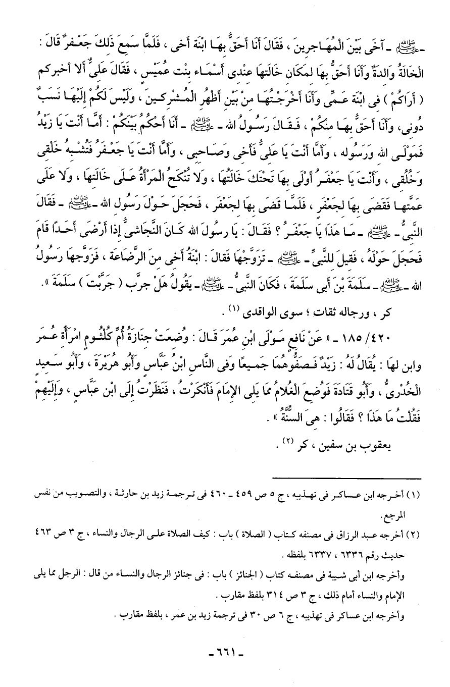 420/ 185 - "عَنْ نَافِعٍ مَوْلَى ابْنِ عُمَرَ قَالَ: وُضِعَتْ جِنَازَةُ أُمِّ كُلْثُومٍ امْرَأَةِ عُمَر وابن لهَا: يُقَالُ لَهُ: زَيْدٌ فَصَفُّوهُمَا جَميعًا وَفى النَّاسِ ابْنُ عَبَّاس وَأَبُو هُرَيْرَةَ، وَأَبُو سَعِيدٍ الْخُدْرىُّ، وَأَبُو قَتَادَةَ فَوُضِعَ الْغُلامُ ممَا يَلِى الإِمَامَ فَأَنْكَرْتُ، فَنَظَرْتُ إِلَى ابْن عَبَّاسٍ، وَإِلَيْهِمْ فَقُلتُ مَا هَذَا؟ فَقَالُوا: هِىَ السُّنَّةُ".