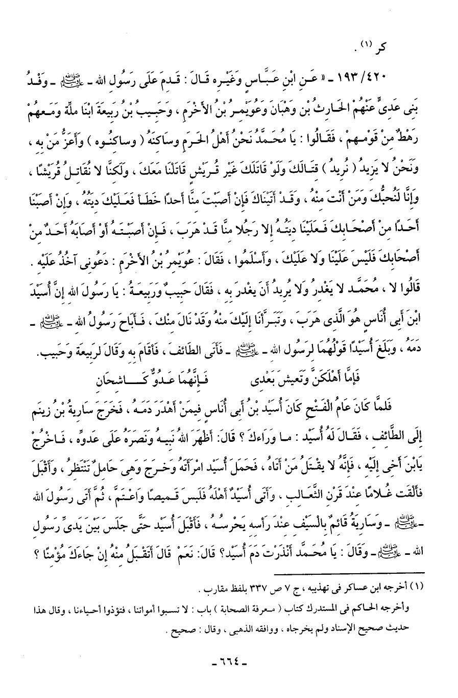 420/ 193 - "عَنِ ابْنِ عَبَّاسٍ وَغَيْرِه قَالَ: قَدِمَ عَلَى رَسُولِ الله - صلى الله عليه وسلم - وَفْدُ بَنِى عَدِىٍّ عَنْهُمْ الحَارِثُ بْن وَهْبَانَ وَعُوَيْمِرُ بْنُ الأَخْرَمِ، وَحَبِيبُ بْنُ رَبِيعَةَ ابْنَا ملِّة وَمَعهُمْ رَهْط مِنْ قَوْمهمْ، فَقَالُوا: يَا مُحَمَّدُ نَحْنُ أَهْلُ الحَرَامِ وسَاكِنَهُ (وساكنُوه) وَأَعَزُّ مَنْ بِهِ، وَنَحْنُ لا يَزِيدُ (نُرِيدُ) قِتَالَكَ وَلَوْ قَاتَلَكَ غَيْر قُرَيْشٍ قَاتَلْنَا مَعَكَ، وَلَكِنَّا لا نُقَاتِلُ قُرَيْشًا، وَإِنَّا لَنُحبُّكَ وَمَنْ أَنْتَ مِنْهُ، وَقَدْ أَتَيْنَاكَ فَإِنْ أَصَبْتَ مِنَّا أَحدًا خَطَأ فَعَلَيْكَ دِيَتُهُ، وَإِنْ أَصَبْنَا أَحَدًا مِنْ أَصْحَابِكَ فَعَلَيْنَا دِيَتُهُ إِلَّا رَجُلًا مِنَّا قَدْ هَرَبَ، فَإِنْ أَصَبْتَهُ أَوْ أَصَابَهُ أَحَدٌ مِنْ أَصْحَابِكَ فَلَيْسَ عَلَيْنَا وَلا عَلَيْكَ، وَأَسْلَمُوا، فَقَالَ: عُوَيْمِرُ بْنُ الأَخْرَمِ: دَعُونِى آخُذُ عَلَيْهِ. قَالُوا لا، مُحَمَّد لا يَغْدِرُ وَلا يُرِيدُ أَنَّ يغْدرَ بِهِ، فَقَالَ حَبِيبٌ وَرَبِيعَةُ: يَا رَسُولَ اللهِ إِنَّ أُسَيْدَ ابْنَ أَبِى أُنَاسٍ هُوَ الَّذِى هَرَبَ، وَتَبَرَّأنَا إِلَيْكَ منْهُ وَقَدْ نَالَ مِنْكَ، فَأَبَاحَ رَسُولُ اللهِ - صلى الله عليه وسلم - دَمَهُ، وَبَلَغَ أُسَيْدًا قَوْلُهُمَا لِرَسُول الله - صلى الله عليه وسلم - فَأَتَى الطَّائفَ، فَأقَامَ بِهِ وَقَالَ لرَبِيعَة وَحَبيب.