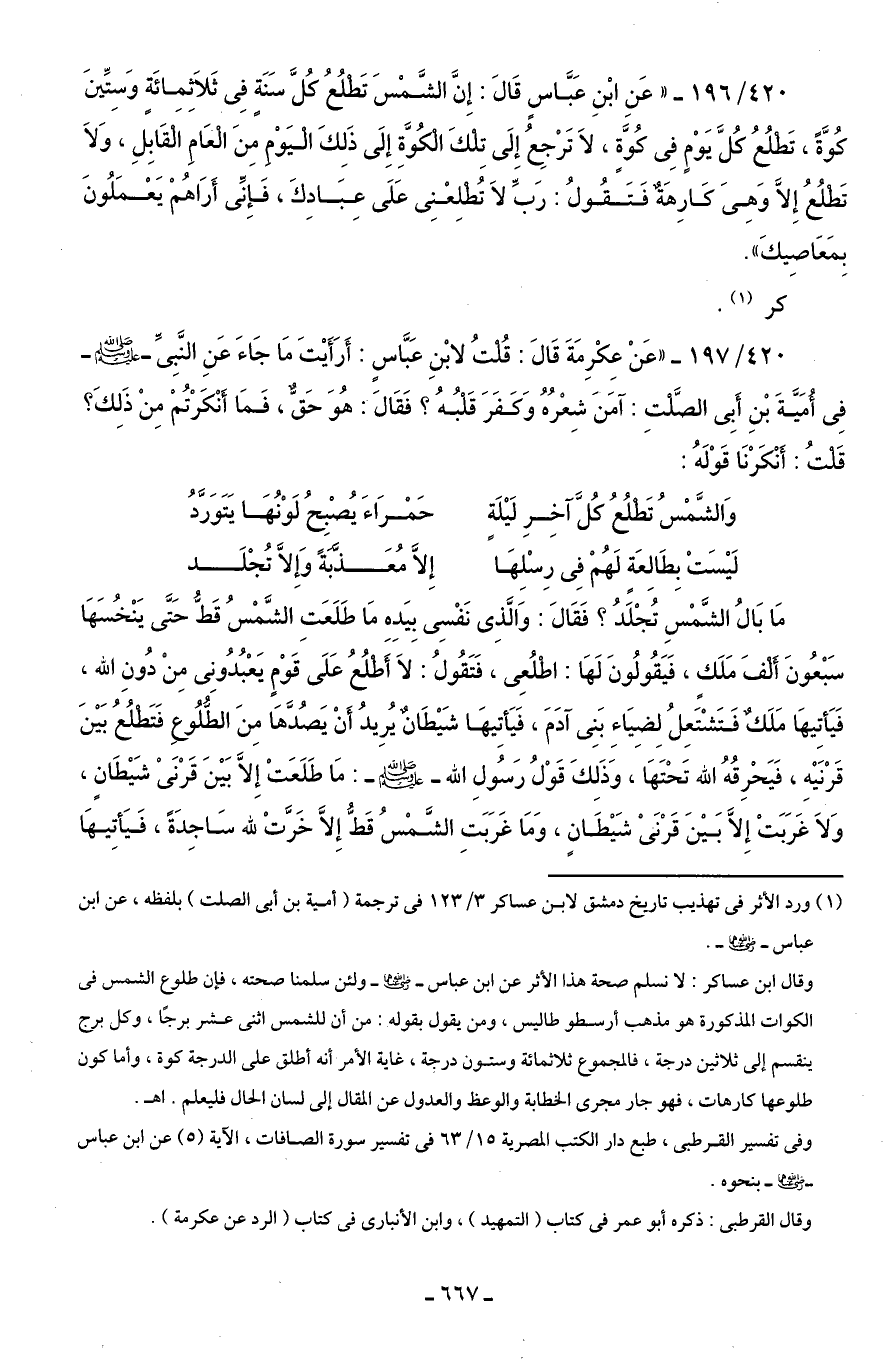 420/ 196 - "عَنِ ابْنِ عَبَّاسٍ قَالَ: إِنَّ الشَّمْسَ تَطْلُعُ كُلَّ سَنَة فِى ثَلاَثِمِائَة وَسِتِّينَ كُوَّةً، تَطْلُعُ كُلَّ يَوْمٍ فِى كُوَّةٍ، لاَ تَرْجِعُ إِلَى تلْكَ الْكُوَّةِ إِلَى ذَلِكَ الْيَوْمِ مِنَ الْعَامِ الْقَابِلَ، وَلاَ تَطْلُعُ إلا وهِىَ كَارِهَةٌ فَتَقُولُ: رَبِّ لاَ تُطْلِعْنِى عَلَى عِبَادِكَ، فَإِنِّى أَرَاهُمْ يَعْمَلُونَ بِمَعَاصِيكَ".