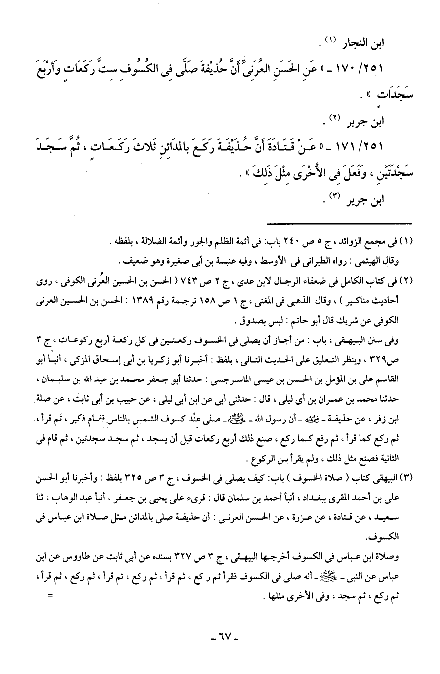 251/ 170 - "عَنِ الحَسَنِ العُرَنِىِّ أَنَّ حُذيْفةَ صَلَّى فِى الكُسُوفِ سِتَّ رَكَعَاتٍ وَأرْبَعَ سَجَدَاتٍ".
