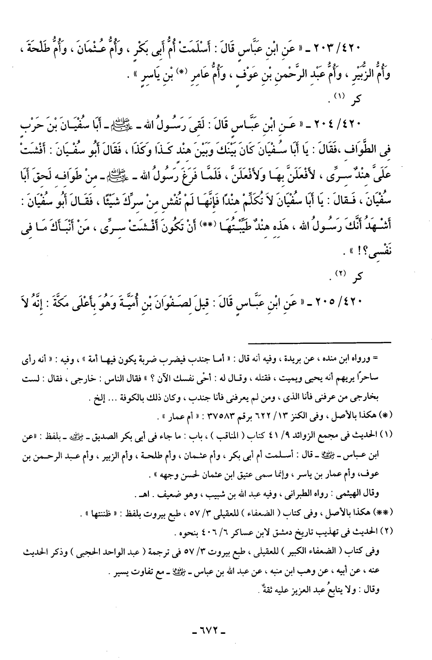 420/ 205 - "عَنِ ابْنِ عَبَّاسٍ قَالَ: قِيلَ لِصَفْوَانَ بْنِ أُمَيَّةَ وَهُوَ بِأعْلَى مَكَّةَ: إِنَّهُ لاَ