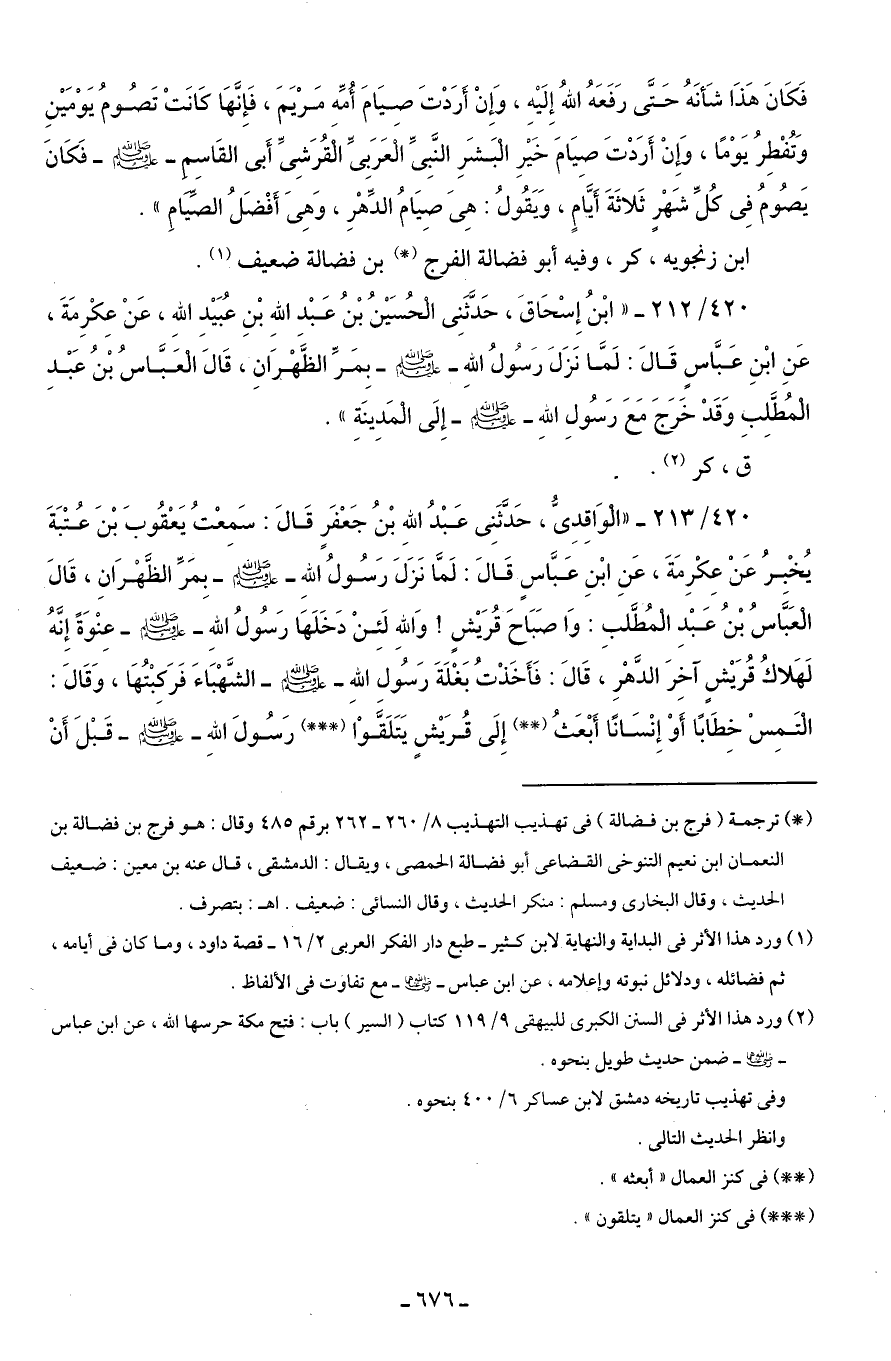 420/ 212 - "ابْنُ إِسْحَاقَ، حَدَّثَنِى الْحُسَيْنُ بْنُ عَبْد اللهِ بْنِ عُبَيْدِ الله، عَنْ عِكْرِمَةَ، عَنِ ابْنِ عَبَّاسٍ قَالَ: لَمَّا نَزَلَ رَسُولُ اللهِ - صلى الله عليه وسلم - بِمَرِّ الظَّهْرَانِ، قَالَ الْعَبَّاسُ بْنُ عَبْدِ الْمُطَّلِبِ وَقَدْ خَرَجَ مَعَ رَسُولِ اللهِ - صلى الله عليه وسلم - إِلَى الْمَدِينَةِ".