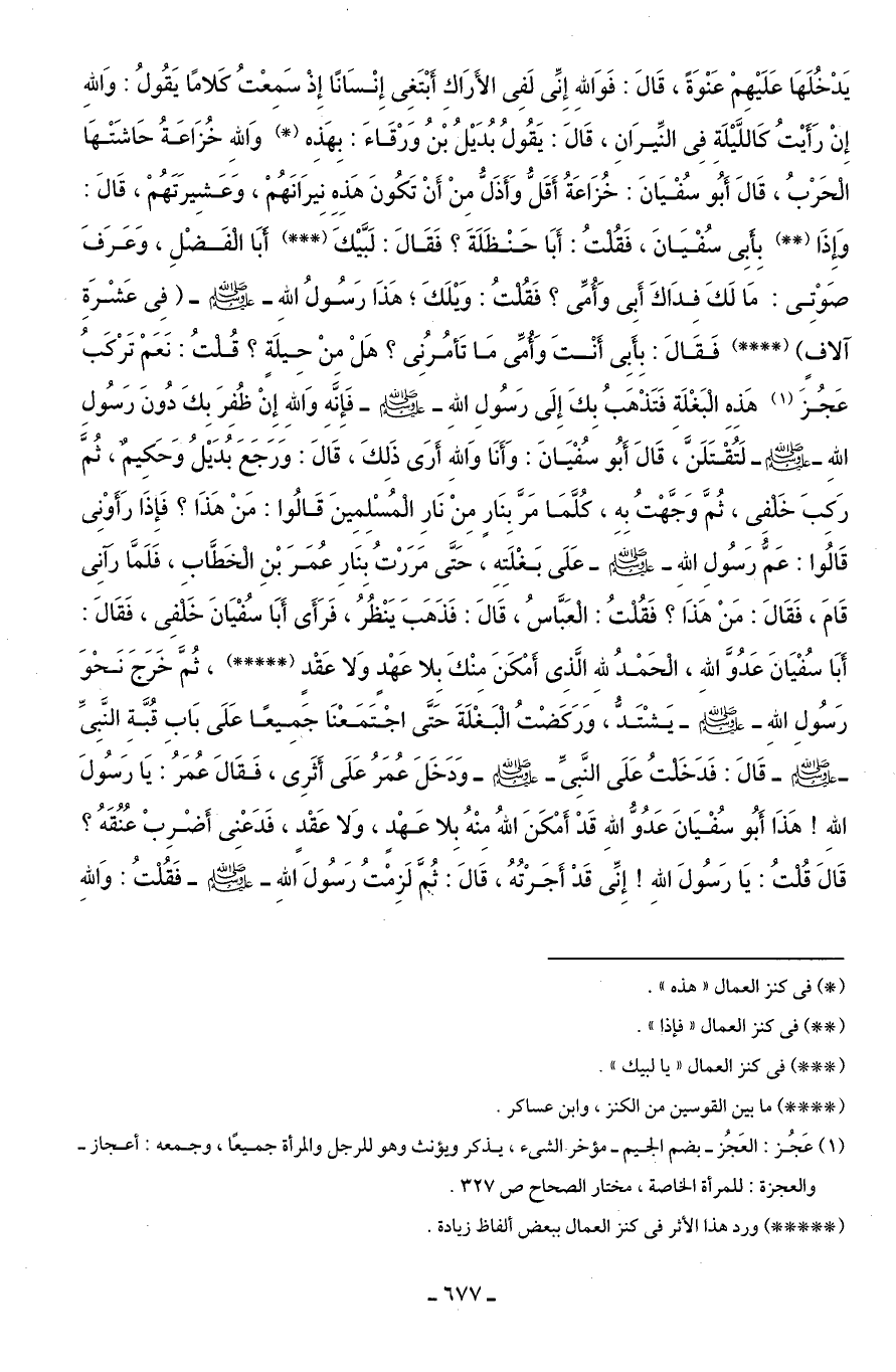 يَدْخُلَهَا عَلَيْهِمْ عَنْوَةً، قَالَ: فَوَاللهِ إِنِّى لَفِى الأَرَاكِ أَبْتَغِى إِنْسَانًا إِذْ سَمِعْتُ كَلامًا يَقُولُ: وَاللهِ إِنْ رَأَيْتُ كَاللَّيْلَةِ فِى النِّيرَانِ، قَالَ: يَقُولُ بُدَيْلُ بْنُ وَرْقَاءَ: بِهَذِه (*) وَاللهِ خُزَاعَةُ حَاشَتْهَا الْحَرْبُ، قَالَ أَبُو سُفْيَانَ: خُزَاعَةُ أَقَلُّ وَأَذَلُّ مِنْ أَنْ تَكُونَ هَذِهِ نِيرَانَهُمْ، وَعَشيرَتَهُمْ، قَالَ: وَإِذَا (* *) بِأَبِى سُفْيَانَ، فَقُلْتُ: أَبَا حَنْظَلَةَ؟ فَقَالَ: لَبَّيْكَ (* * *) أَبَا الْفَضْلِ، وَعَرَفَ صَوْتِى: مَا لَكَ فِدَاكَ أَبِى وَأُمِّى؟ فَقُلْتُ: وَيْلَكَ، هَذَا رَسُولُ اللهِ - صلى الله عليه وسلم - (فِى عَشْرَةِ آلافٍ) (* * * *) فَقَالَ: بِأَبِى أَنْتَ وأَمِّى مَا تَأمُرُنِى؟ هلْ مِنْ حِيلَةِ؟ قُلْتُ. نَعَمْ تَركَبُ عَجُزَ (¬1) هَذِهِ الْبَغْلَةِ فَتَذْهبُ بِكَ إِلَى رَسُولِ اللهِ - صلى الله عليه وسلم - فَإِنَّهِ وَاللهِ إِنْ ظُفِرَ بِكَ دُونَ رَسُولِ اللهِ - صلى الله عليه وسلم - لَتُقْتَلَنَّ، قَالَ أَبُو سُفْيَانَ: وَأَنَا وَاللهِ أَرَى ذَلكَ، قَالَ: وَرَجَعَ بُدَيْلُ وَحَكِيمٌ، ثُمَّ رَكِبَ خَلْفِى، ثُمَّ وَجَّهْتُ بِهِ، كُلَّمَا مَرَّ بِنَارٍ مِنْ نَارِ الْمُسْلِمِينَ قَالُوا: مَنْ هَذَا؟ فَإِذَا رَأَوْنِى قَالُوا: عَمُّ رَسُولِ اللهِ - صلى الله عليه وسلم - عَلَى بَغْلَتِهِ، حَتَّى مَرَرْتُ بِنَارِ عُمَرَ بْنِ الْخَطَّاب، فَلَمَّا رَآنِى قَامَ، فَقَالَ: مَنْ هَذَا؟ فَقُلْتُ: الْعَبَّاسُ، قَالَ: فَذَهَبَ يَنْظُرُ، فَرَأَى أَبَا سُفْيَانَ خَلْفِى، فَقَالَ: أَبَا سُفْيَانَ عَدُوَّ اللهِ، الْحَمْدُ للهِ الَّذِى أَمْكَنَ مِنْكَ بِلا عَهْدٍ وَلا عَقْدٍ (* * * * *)، ثُمَّ خَرَجَ نَحْوَ رَسُولِ الله - صلى الله عليه وسلم - يَشْتَدُّ، وَرَكَضْتُ الْبَغْلَةَ حَتَّى اجْتَمَعْنَا جَمِيعًا عَلَى بَابِ قُبَّةِ النَّبِىِّ - صلى الله عليه وسلم - قَالَ: فَدَخَلتُ عَلَى النَّبِىِّ - صلى الله عليه وسلم - وَدَخَلَ عُمَرُ عَلَى أَثَرِى، فَقَالَ عُمَرُ: يَا رَسُولَ اللهِ! هَذَا أَبُو سُفْيَانَ عَدُوُّ اللهِ قَدْ أَمْكَنَ الله مِنْهُ بِلا عَهْدٍ، وَلا عَقْدِ، فَدَعْنِى أَضْرِبْ عُنُقَهُ؟ قَالَ قُلْتُ: يَا رَسُولَ اللهِ! إِنِّى قَدْ أَجَرْتُهُ، قَالَ: ثُمَّ لَزِمْتُ رَسُولَ اَللهِ - صلى الله عليه وسلم - فَقُلْتُ: وَاللهِ
