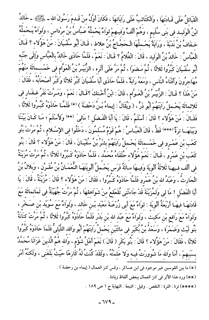 الْقَبَائِلُ عَلَى قَادَتِهَا، وَالْكَتَائِبُ عَلَى رَايَاتِهَا، فَكَانَ أَوَّلُ مِنْ قَدِمَ رَسُولَ اللهِ - صلى الله عليه وسلم - خَالِدُ ابْنُ الْوَلِيدِ فِى بَنِى سُلَيِمٍ، وَهُمْ أَلْفٌ وَفيهِمْ لِوَاءٌ ويَحْمِلُهُ عَبَّاسُ بْنُ مِرْداسٍ، وَلِوَاءٌ ويَحْمِلُهُ خفَافُ بْنُ نَدْبَةَ، وَرَايَةٌ يَحْمِلُهَا الْحَجَّاجُ بْنُ عِلاطٍ، قَالَ أَبُو سُفْيَانَ: مَنْ هَؤُلاءِ؟ قَالَ الْعَبَّاسُ: خَالِدُ بْنُ الْوَلِيدِ، قَالَ: الْغُلامُ؟ قَالَ: نَعَمْ، فَلَمَّا حَاذَى خَالِدٌ بِالْعَبَّاسِ وَإِلَى جَنْبِهِ أَبُو سُفْيَانَ كَبَّرُوا ثَلاثًا، ثُمَّ مَضَوْا، ثُمَّ مَرَّ عَلَى أَثَرِهِ، الزُّبيْرُ بْنُ الْعَوَّامِ فِى خَمْسِمِائَةٍ مِنْهُمْ مُهَاجِرُونَ وَأَفْنَاءُ النَّاسِ، وَمَعَهُ رَايَةٌ، فَلَمَّا حَاذَى أَبَا سُفْيَانَ كَبَّرَ ثَلاثًا وَكَبَّرَ أَصْحَاُبهُ، فَقَالَ: مَنْ هَذَا؟ قَالَ: الزُّبَيْرُ بْنُ الْعَوَّامِ، قَالَ: ابْنُ أُخْتِكَ؟ قَالَ: نَعَمْ، وَمَرَّتْ نَفَرُ غِفَارٍ فِى ثَلاثِمِائَةٍ يَحْمِلُ رَايَتَهُمْ أَبُو ذَرٍّ، (وَيُقَالُ: إِيماءُ بْنُ دَحْضَةَ) (*) فَلَمَّا حَاذَوْهُ كَبَّرُوا ثَلاثًا، فَقَالَ: مَنْ هَؤُلاءِ؟ قَالَ: أَسْلَمُ، قَالَ: يَا أَبَا الْفَضْلِ! مَالِىَ (* *) وَلأَسْلَمَ؛ مَا كَانَ بَيْنَنَا وَبَيْنَهَا تِرَةٌ (* * *) قَطُّ، قَالَ الْعَبَّاسُ: هُمْ قَوْمٌ مُسْلِمُونَ، دَخَلُوا فِى الإِسْلامِ، ثُمَّ مَرَّتْ بَنُو كَعْبِ بْنِ عَمْرٍو فِى خَمْسِمِائَةٍ يَحْمِلُ رَايَتَهُمْ بِشْرُ بْنُ سُفْيَانَ، قَالَ: مَنْ هَؤُلاء؟ قَالَ: بَنُو كَعْبِ بْنِ عَمْرٍو، قَالَ: نَعَمْ هَؤُلاءِ حُلَفَاءُ مُحَمَّدٍ، فَلَمَّا حَاذَوْهُ كَبَّرُوا ثَلاثًا، ثُمَّ مَرَّتْ مُزَيْنَةُ فِى أَلْفٍ فِيها ثَلاثَةُ ألْوِيَةٍ وَفِيهَا مِائَةُ فَرَسٍ يَحْمِلُ أَلْوِيَتهَا النُّعْمَانُ بْنُ مُقَرِّنٍ، وَبِلالُ بْنُ الْحَارِثُ، وَعَبْدُ اللهِ بْنُ عَمْرٍو فَلَمَّا حَاذَوْهُ كَبَّرُوا، فَقَالَ: مَنْ هَؤُلاءِ؟ قَالَ: مُزَيْنَةُ، قَالَ: يَا أَبَا الْفَضْلِ! مَا لِى وَلمُزَيْنَةَ قَدْ جَاءَتْنِى تُقَعقِعُ مِنْ شَوَاهِقهَا، ثُمَّ مَرَّتْ جُهَيْنَةُ فِى ثَمَانِمائَةٍ مَعَ قَادَتِهَا فِيهَا أرْبَعَةُ أَلْوِيَةٍ: لِوَاءٌ ومَعَ أَبِى زُرْعَةَ مَعْبَدِ بْنِ خَالِدٍ، وَلِوَاءٌ ومَعَ سُوَيْدِ بْنِ صَخْرٍ، وَلِوَاءٌ مَعَ رَافِع بْنِ مَكِيثٍ، وَلِوَاءٌ مَعَ عَبْدِ اللهِ بْنِ بَدْرٍ فَلَمَّا حَاذَوْهُ كَبَّرُوا ثَلاثًا، ثُمَّ مَرَّتْ كنَانَةُ بَنُو لَيْثِ وَضَمْرَة، وَسَعْدُ بْنُ بُكَيْرٍ فِى مِائَتَيْنِ يَحْمِلُ رَايَتَهُمْ أَبُو وَاقِد اللَّيْثِىُّ فَلَمَا حَاذَوْهُ كَبَّرُوا ثَلاثًا، فَقَالَ: مَنْ هَؤُلاءِ؟ قَالَ: بَنُو بَكْرٍ (قَالَ) نَعَمْ أَهْلُ شُؤْمٍ، وَاللهِ هُمُ الَّذِينَ غَزَانَا مُحَمَّدٌ بِسَبَبِهِمْ، أَمَا وَاللهِ مَا شُوورْتُ فِيهِ وَلا عَلِمْتُهُ، وَلَقدْ كُنْتُ لَهُ كَارِهًا حَيْثُ بَلَغَنِى، وَلَكِنَّهُ أَمْر