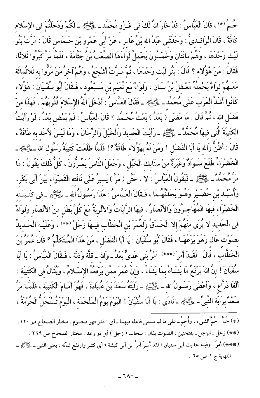 حُمَّ (*)، قَالَ الْعَبَّاسُ: قَدْ خَارَ الله لَكَ فِى غَزْوِ مُحَمَّد - صلى الله عليه وسلم - لَكُمْ وَدَخَلْتُمْ فِى الإِسْلامِ كَافَّةً، قَالَ الْوَاقِدِىُّ: وَحَدَّثَنِى عَبْدُ اللهِ بْنُ عَامِرٍ، عَنْ أَبِى عَمْرِو بْنِ حَمَاسٍ قَالَ: مَرَّتْ بَنُو لَيْثِ وَحْدَهَا، وَهُمْ مِائَتَانِ وَخَمْسُونَ يَحْمِلُ لَوَاءها الصَّعبُ بْنُ جَثَّامَةَ، فَلَمَّا مَرَّ كَبَّرُوا ثَلاثًا، فَقَالَ: مَنْ هؤُلاءِ؟ قَالَ: بَنُو لَيْثِ وَحدها، ثُمَّ مَرَّتْ أَشْجَعُ، وَهُم آخِرُ مَنْ مَرُّوا بِهِ ثَلاثُمِائَة مَعَهُمْ لِوَاءٌ يَحمِلُهُ معقِلُ بْنُ سَنانَ، وَلِوَاءٌ مَعَ نُعَيْم بْنِ مَسْعُودٍ، فَقَالَ أَبُو سُفْيَانِ: هؤُلاءِ كَانُوا أَشَدَّ الْعَرَب عَلَى مُحَمَّدِ - صلى الله عليه وسلم - فَقَالَ الْعَبَّاسُ: أَدخَلَ اللهُ الإِسْلامَ قُلُوبَهُم، فَهذَا مِنْ فَضْلِ الله، ثُمَّ قَالَ: مَا مَضَى (بَعدُ) بَغثُ مُحَمَّدٍ؟ قَالَ العَبَّاسُ: لَمْ يَمضِ بَعْدُ، لَوْ رَأَيْتُ الْكَتِيبَةَ التِى فِيها مُحَمَدٌ - صلى الله عليه وسلم - رَأَيْتَ الْحَدِيدَ وَالخَيْلَ وَالرِّجَالَ، وَمَا لَيْسَ لأحَدِ بِهِ طَاقَةٌ، قَالَ: أَظُنُّ وَاللهِ يَا أَبَا الْفَضْلِ! وَمَنْ لَهُ بِهؤُلاء طَاقَة؟ ! فَلَمَّا طَلَعَتْ كَتِيبَةُ رَسُولِ الله - صلى الله عليه وسلم - الخَضْرَاءُ طَلَعَ سَوَادٌ وَغَبَرَةٌ مِنْ سَنَابِكِ الْخَيْلَ، وَجَعَلَ النَّاسُ يَمُرُّونَ، كلُّ ذَلِكَ يَقُولُ: مَا مَرَّ مُحَمَّد - صلى الله عليه وسلم - فَيَقُولُ الْعَبَّاس: لا، حَتَّى (مَرَّ) يَسِيرُ عَلَى نَاقَتِهِ الْقَصوَاءِ بَيْنَ أَبَى بَكْرٍ، وَأسَيْد بْنِ حُضَيْرٍ وَهُوَ يُحَدِّثهُمَا، فَقَالَ الْعَبَّاسُ: هذَا رَسُولُ اللهِ - صلى الله عليه وسلم - فِى كتِيبَتِه الخَضْرَّاء فِيها المهاجِرُونَ وَالأنْصَارُ، فِيها الرَّايَاتُ وَالألوِيَةُ مَعَ كلِّ بَطَلٍ مِنَ الأَنْصَارِ وَلِوَاءَ فِى الحَدِيَدِ لا يُرَى مِنْهُم إِلا الْحَدَقُ وَلِعُمَرَ بْنِ الخَطَّاب فيها زَجَلٌ (* *)، وَعَلَيْهِ الحَدِيدُ بِصَوْتٍ عَالٍ وَهُوَ يَزَعُها، فَقَالَ أَبُو سُفْيَانَ: يَا أَبَا الْفَضْلَ، مَنْ هذَا الْمُتَكَلِّمُ؟ قَالَ عُمَرُ بْنَ الخَطَّابِ، قَالَ: لَقَد أَمِرَ (* * *) أمرُ بَنِى عَدىٍّ بَعدُ - وَاللهِ - قِلة وَذِلَّة، فَقَالَ العباس: يَا أَبَا سُفْيَانَ! إِنَّ الله يَرفَعُ مَا يَشَاءُ بِمَا يَشَاءُ، وَإنَّ عُمَرَ مِمَّنْ يَرفَعُهُ الإِسْلامُ، وَيُقَالُ فِى الْكَتيبَةِ: أَلفَا ذَرَّاع، وَأَعطَى رَسَولُ الله - صلى الله عليه وسلم - رَايَتَهُ سَعدَ بْنَ عُبَادَةَ، فَهُوَ أَمَامَ الْكَتِيبَةِ، فَلَمَّا مَرَّ سَعدٌ بِرَايَةِ النَّبِىِّ - صلى الله عليه وسلم - نَادَى: يَا أَبَا سُفْيَانَ! الْيَوْمَ يَوْمُ الْمَلحَمَةِ، الْيَوْمَ تُسْتَحَلُّ الْحُرمَةُ،