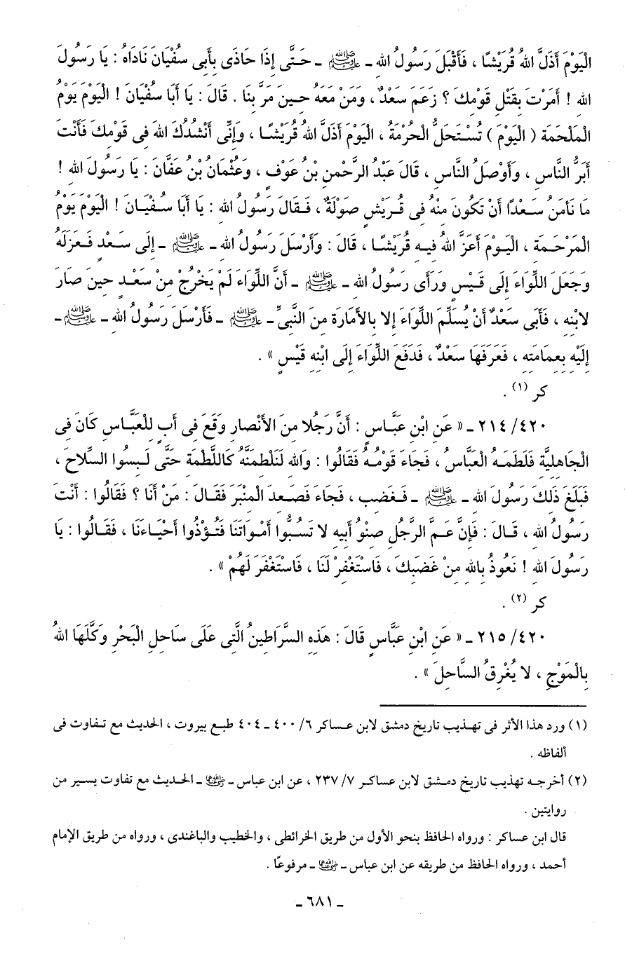 420/ 412 - "عَنِ ابْنِ عَبَّاسٍ: أَنَّ رَجُلا مِنَ الأنصارِ وَقَعَ فِى أَبٍ لِلْعَبَّاسِ كَانَ فِى الْجَاهِلِيَّةِ فَلَطَمَهُ الْعَبَّاسُ، فَجَاءَ قَوْمُهُ فَقَالُوا: وَاللهِ لَنَلْطمَنَّهُ كَاللَّطمَةِ حَتَّى لَبِسُوا السَلاحَ، فَبَلَغَ ذَلِكَ رَسُولَ اللهِ - صلى الله عليه وسلم - فَغَضِب، فَجَاءَ فَصَعِدَ المِنْبَرَ فَقَالَ: مَنْ أَنَا؟ فَقَالُوا: أَنْتَ رَسُولُ اللهِ، قَالَ: فَإِنَّ عَمَّ الرَّجُلِ صِنْوُ أَبِيهِ لا تَسُبُّوا أَموَاتَنَا فَتُؤْذُوا أَحْيَاءَنَا، فَقَالُوا: يَا رَسُولَ اللهِ! نَعُوذُ بِاللهِ مِنْ غَضَبِكَ، فَاسْتَغْفِر لَنَا، فَاسْتَغْفرَ لَهُم".