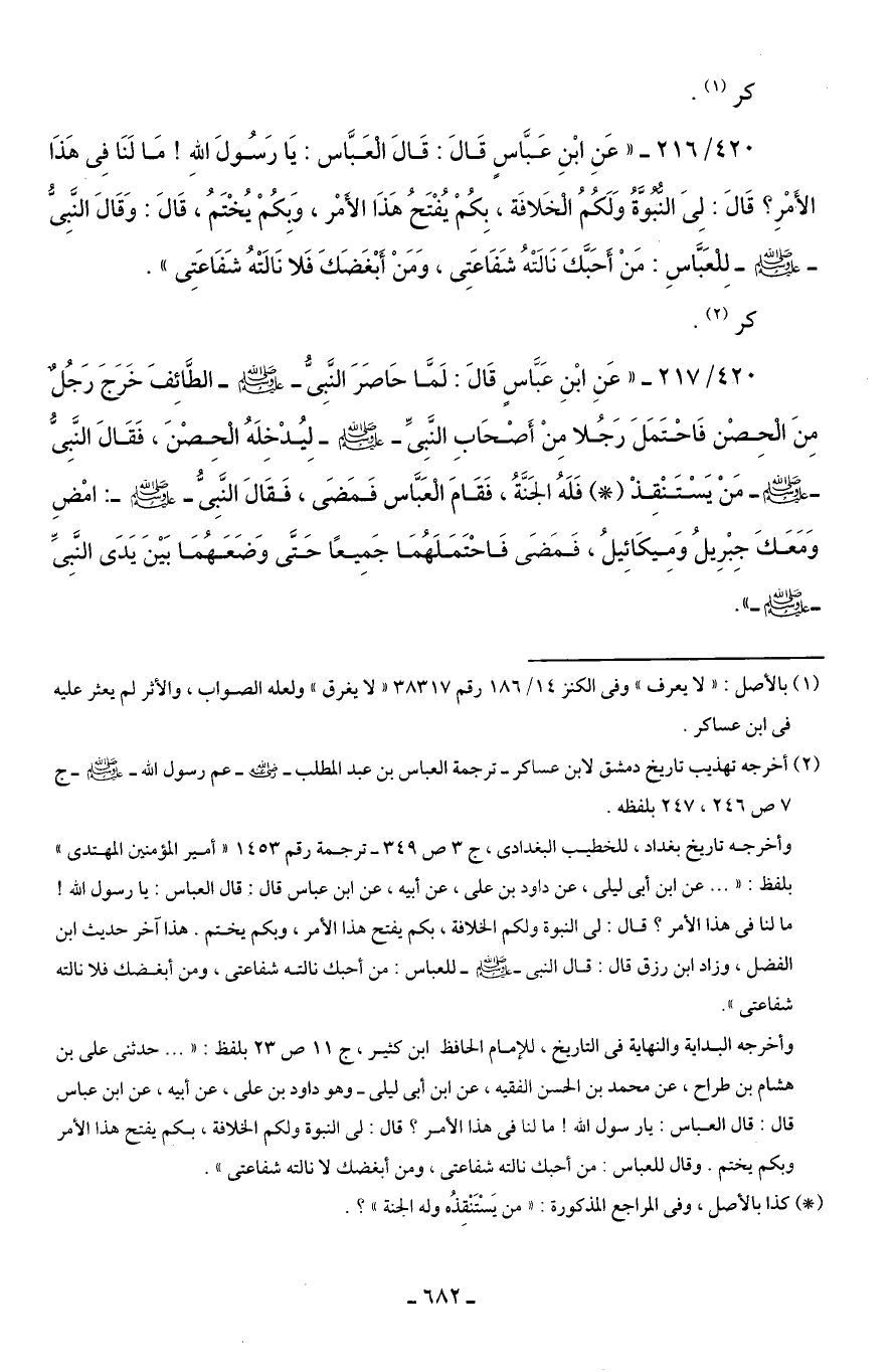 420/ 216 - "عَنِ ابْنِ عَبَّاسٍ قَالَ: قَالَ الْعَبَّاس: يَا رَسُولَ اللهِ! مَا لَنَا فِى هذَا الأَمرِ؟ قَالَ: لِىَ النبوَّةُ وَلَكُمُ الْخَلافَة، بِكُم يُفْتَحُ هذَا الأمر، وَبِكم يُخْتَمُ، قَالَ: وَقَالَ النبِيُّ - صلى الله عليه وسلم - لِلعَبَّاسِ: مَنْ أَحَبَّكَ نَالَتْهُ شَفَاعَتِى، وَمَنْ أَبْغَضَكَ فَلا نَالَتْهُ شَفَاعَتِى".