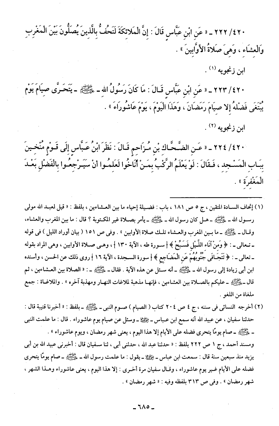 420/ 222 - "عَنِ ابْنِ عَبَّاسٍ قَالَ: إِنَّ الْمَلائِكَةَ لَتَحُفُّ بِالَّذِينَ يُصَلُّونَ بَيْنَ الْمَغْرِبِ وَالعِشَاءِ، وَهِىَ صَلاةُ الأوَّابِينَ".