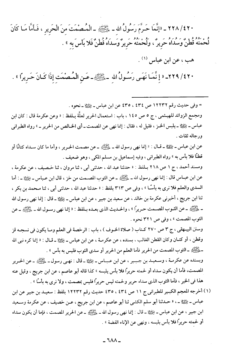 420/ 229 - "إنَّمَا نَهى رَسُولُ اللهِ - صلى الله عليه وسلم - عَنِ الْمُصْمَتِ إِذَا كَانَ حَرِيرًا".
