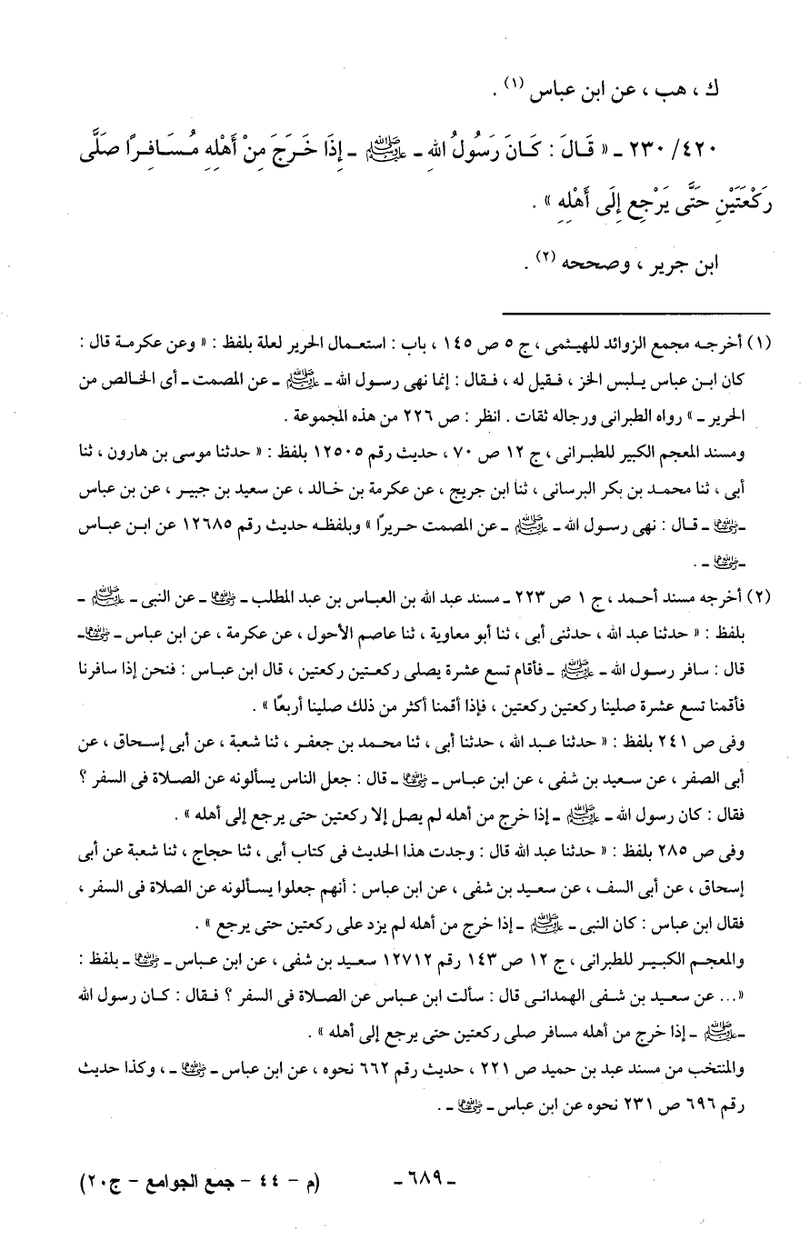 420/ 230 - "قَالَ: كَانَ رَسُولُ اللهِ - صلى الله عليه وسلم - إِذَا خَرَجَ مِنْ أَهْلِهِ مُسَافِرًا صَلَّى رَكْعَتَيْنِ حَتَّى يرجِع إِلَى أَهْلِهِ".