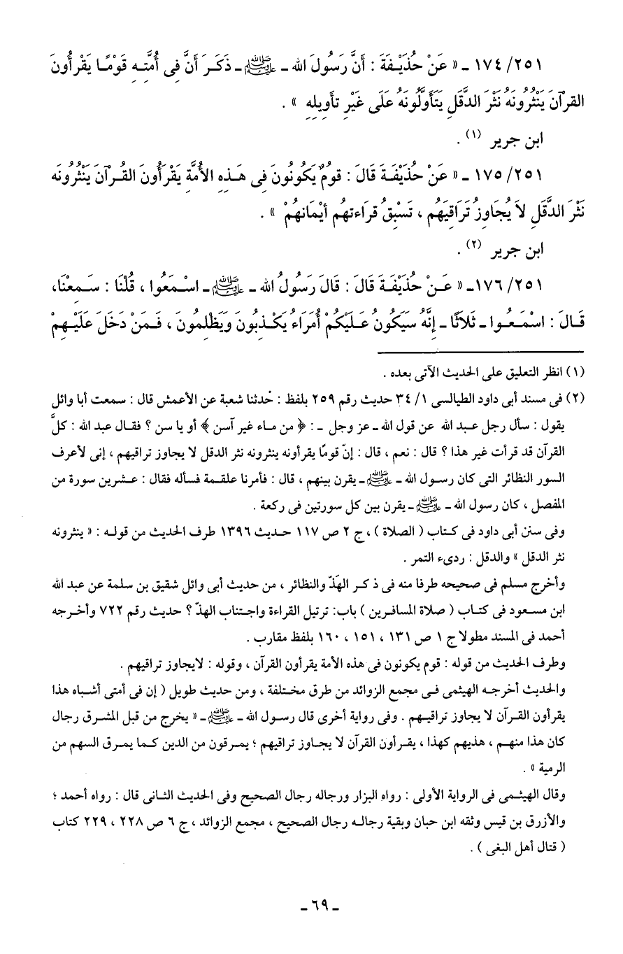 251/ 175 - "عَنْ حُذَيْفَةَ قَالَ: قوُمٌ يَكُونُونَ فِى هَذِهِ الأُمَّةِ يَقْرَأُونَ القُرْآنَ يَنْثُرُونَه نَثْرَ الدَّقَلِ لَا يُجَاوِزُ تَرَاقِيَهُم، تَسْبِقُ قرَاءتهُم أيْمَانهُمْ".
