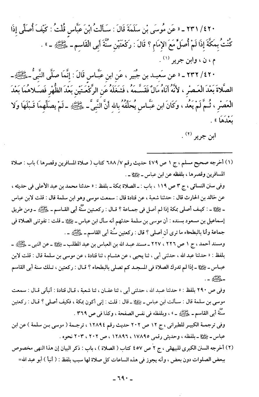 420/ 231 - "عَن مُوسَى بْن سَلَمَةَ قَالَ: سَألتُ ابْنَ عَبَّاس قُلتُ: كَيْفَ أُصَلِّى إِذَا كُنْتُ بِمَكَّةَ إِدا لَمْ أُصَل مَعَ الإِمَامِ؟ قَالَ: رَكعَتَيْنِ سُنَّةَ أَبِى الْقَاسِم - صلى الله عليه وسلم - ".