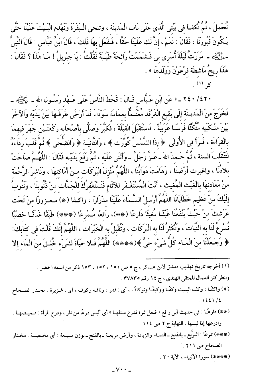 420/ 240 - "عَن ابْنِ عَبَّاسٍ قَالَ: قَحَطَ النَّاسُ عَلَى عَهْدِ رَسُول اللهِ - صلى الله عليه وسلم - فَخَرجً مِنَ الْمَدينَةِ إِلَى بَقِيعِ الْغَرْقَد مُعْتَمًّا بعمَامَة سَوْدَاءَ قَدْ أَرْخَى طَرَفَهَا بَيْنَ يَدَيْهِ وَالآخَرَ بَيْنَ منْكَبَيهِ مُتَّكِئًا فَرَسًا عَرَبيَةً، فَاسْتَقْبَلَ الْقَبْلَةَ، فَكَبَّرَ وَصَلَّى بأَصْحَابه رَكْعَتَيْنِ جَهَرَ فِيهِمَا بِالْقِرَاءَةِ، قَرَأَ فِى الأُولَى {إِذَا الشَّمْسُ كُوِّرَتْ}، وَالثَّانيَةِ {وَالضُّحَى} ثُمَّ قَلَبَ رِدَاءَهُ لِتَنْقَلِبَ السنة، ثُمَّ حَمِدَ اللهَ - عَزَ وَجَلَّ - وَأَثْنَى عَلَيْهِ، ثُمَّ رَفَعَ يَدَيْه فَقَالَ: اللَّهُمَّ صَاحَتْ بِلادُنَا، واغبرت أَرْضنَا، وَهَامَتْ دَوَابُّنَا، اللَّهُمَّ منزِلَ الْبَرَكَاتِ مِنْ أَمَاكِنِهَا، وَنَاشِرَ الرَّحْمَةِ مِنْ مَعَادِنِهَا بِالْغَيْثِ الْمُغِيثِ، أَنْتَ الْمُسْتَغْفَر للآثَامِ فَنَسْتَغْفِرُكَ لِلجَمَّاتِ مِنْ ذُنُوبِنَا، وَنَتُوبُ إِلَيْكَ مِنْ عَظِيم خَطَايَانَا اللَّهُمَّ أَرْسِلْ السَّمَاءَ عَلَيْنَا مِدْرَارًا، واكفا (*) معزوزًا مِنْ تَحْت عَرْشِكَ مِنْ حَيْثُ يَنْفَعُنَا غَيْثًا مُغِيثًا دَارعًا (* *)، رَائِعًا مُمْرِعًا (* * *) طَبَقًا غَدَقًا خِصْبًا تُسْرِعُ لَنَا به النَّبَاتَ، وَتُكْثرُ لَنَا بِهِ الْبَرَكَاتِ، وَتُقْبِلُ بِه الْخَيْرَات، اللَّهُمَّ إِنَّكَ قُلتَ فِى كِتَابكَ: {وَجَعَلْنَا مِنَ الْمَاءِ كُلَّ شَيْءٍ حَيٍّ} (* * * *) اللَّهُمَّ فَلا حَيَاةَ لِشَىْءٍ خُلِقَ مِنَ الْمَاءَ إِلا