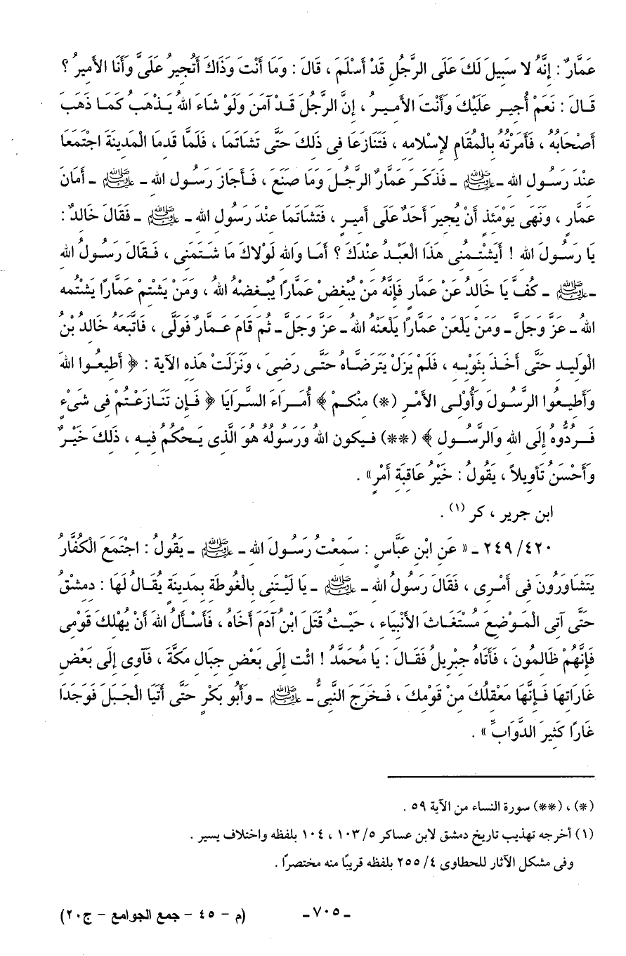 عَمَّار: إِنَّهُ لا سَبِيلَ لَكَ عَلَى الرَّجُلِ قَدْ أَسْلَمَ، قَالَ: وَمَا أَنْتَ وَذَاكَ أَتُجِيرُ عَلَىَّ وَأَنَا الأمِيرُ؟ قَالَ: نَعَمْ أُجِير عَلَيْكَ وَأَنْتَ الأمِيرُ، إِنَّ الرَّجُلَ قَدْ آمَنَ وَلَوْ شَاءَ الله يَذْهَبُ كَمَا ذَهَبَ أَصْحَابُهُ، فَأَمَرْتُهُ بِالْمُقَامِ لإِسْلامِهِ، فَتَنَازَعَا فِى ذَلِكَ حَتَّى تَشَاتَمَا، فَلَمَّا قَدِمَا الْمَدِينَةَ اجْتَمَعَا عِنْدَ رَسُولِ اللهِ - صلى الله عليه وسلم - فَذَكَرَ عَمَّارٌ الرَّجُلَ وَمَا صَنَعَ، فَأَجَازَ رَسُول الله - صلى الله عليه وسلم - أَمَانَ عَمَّارٍ، وَنَهَى يَوْمَئِذٍ أَنْ يُجِيرَ أَحَدٌ عَلَى أَمِيرٍ، فَتَشَاتَمَا عِنْدَ رَسُولِ اللهِ - صلى الله عليه وسلم - فَقَالَ خَالِدٌ: يَا رَسُولَ اللهِ! أَيَشْتِمُنِى هَذَا الْعَبْدُ عِنْدَكَ؟ امَا وَاللهِ لَوْلاكَ مَا شَتَمَنِى، فَقَالَ رَسُولُ اللهِ - صلى الله عليه وسلم - كُفَّ يَا خَالِدُ عَنْ عَمَّارٍ فَإنَّهُ مَنْ يبغِضْ عَمَّارًا يبغِضْهُ الله، وَمَنْ يَشْتِمْ عَمَّارًا يَشْتُمه الله - عَزَّ وَجَلَّ - وَمَنْ يَلعَنْ عَمَّارًا يَلعَنْهُ الله - عَزَّ وَجَلَّ - ثُمَّ قَامَ عَمَّار فَوَلَّى، فَاتَّبَعَهُ خَالِدُ بْنُ الْوَلِيدِ حَتَّى أَخَذَ بِثَوْبِهِ، فَلَمْ يَزَلْ يَتَرَضَّاهُ حَتَّى رَضِىَ، وَنَزَلَتْ هَذِهِ الآية: {أَطِيعُوا اللَّهَ وَأَطِيعُوا الرَّسُولَ وَأُولِي الْأَمْرِ (*) مِنْكُمْ} أُمَرَاءَ السَّرَايَا {فَإِنْ تَنَازَعْتُمْ فِي شَيْءٍ فَرُدُّوهُ إِلَى اللَّهِ وَالرَّسُولِ} (* *) فيكون الله وَرَسُولُهُ هُوَ الَّذِى يَحْكُمُ فِيهِ، ذَلِكَ خَيْرٌ وَأَحْسَنُ تَأوِيلًا، يَقُولُ: خَيْرُ عَاقِبَةِ أَمْرٍ".