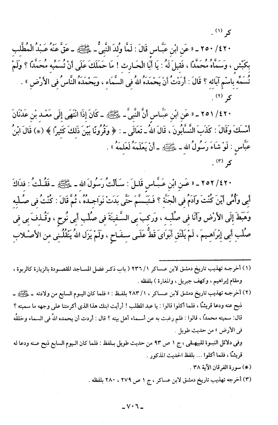 420/ 250 - "عَنِ ابْنِ عَبَّاسٍ قَالَ: لَمَّا ولُدَ النَّبِىُّ - صلى الله عليه وسلم - عَقَّ عَنْهُ عَبْدُ الْمُطَّلِبِ بِكَبْشٍ، وَسَمَّاهُ مُحَمَّدًا، فَقِيلَ لَهُ: يَا أَبَا الْحَارِثِ! مَا حَمَلَكَ عَلَى أَنْ تُسَمِّيهِ مُحَمَّدًا؟ وَلَمْ تُسَمِّهِ بِاسْم آبَائِهِ؟ قَالَ: أَرَدْتُ أَنْ يَحْمَدَهُ الله فِى السَّمَاءِ، وَيَحْمَدَهُ النَّاسُ فِى الأَرْضِ".