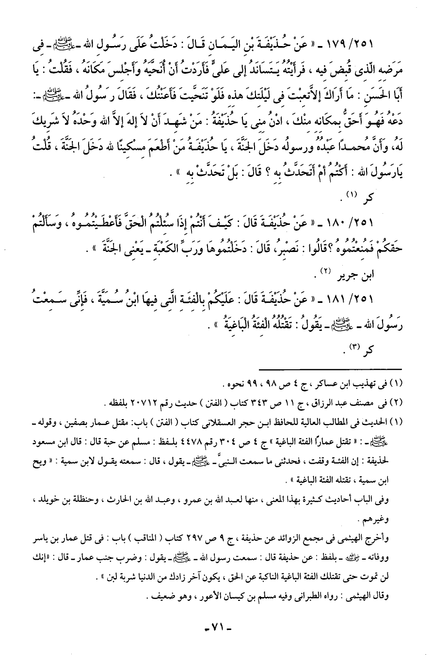 251/ 181 - "عَنْ حُذَيْفَةَ قَالَ: عَلَيْكُمْ بِالْفِئَةِ الَّتِى فِيهَا ابْنُ سُمَيَّةَ، فَإِنِّى سَمِعْتُ رَسُولَ الله - صلى الله عليه وسلم - يَقُولُ: تَقْتُلُهُ الْفِئَةُ الْبَاغِيَةُ".