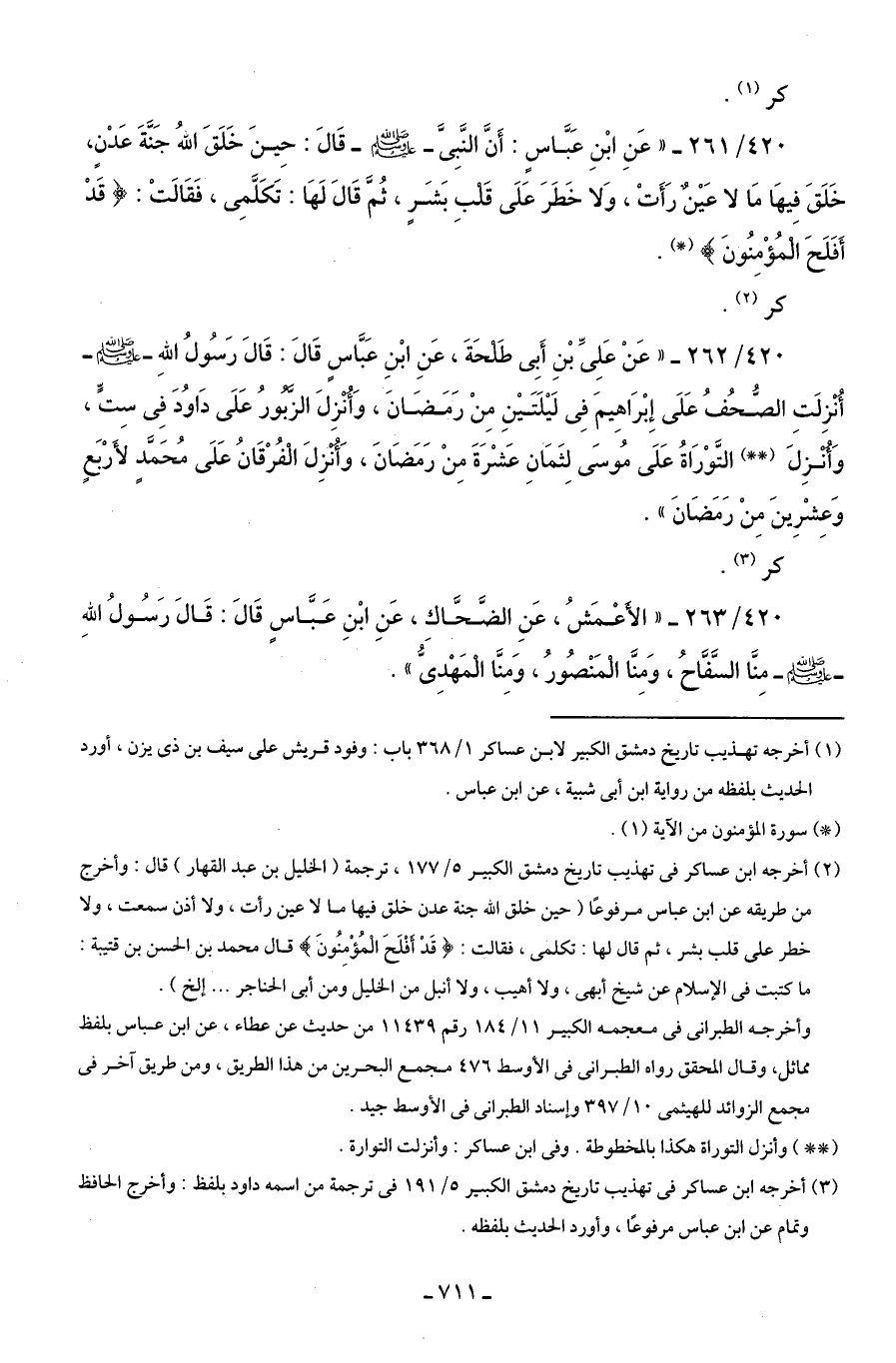 420/ 262 - "عَنْ عَلىِّ بْن أبى طَلحَةَ، عَنِ ابْنِ عَبَّاس قَالَ: قَالَ رَسُولُ الله - صلى الله عليه وسلم - أُنْزِلتِ الصُّحُفُ على إِبراهِيم فِى لَيْلَتَيْنِ مِنْ رَمَضَانَ، وَأُنْزِلَ الزَّبُورُ عَلَى دَاوُدَ فِى سِتٍّ، وَأُنزِلَ (* *) التَّوْرَاةُ عَلَى مُوسَى لِثَمَانِ عَشْرَةَ مِنْ رَمَضَانَ، وَأنزِلَ الْفُرْقَانُ عَلَى مُحَمَّدٍ لأَرْبَعٍ وَعِشْرِينَ مِنْ رَمَضَانَ".