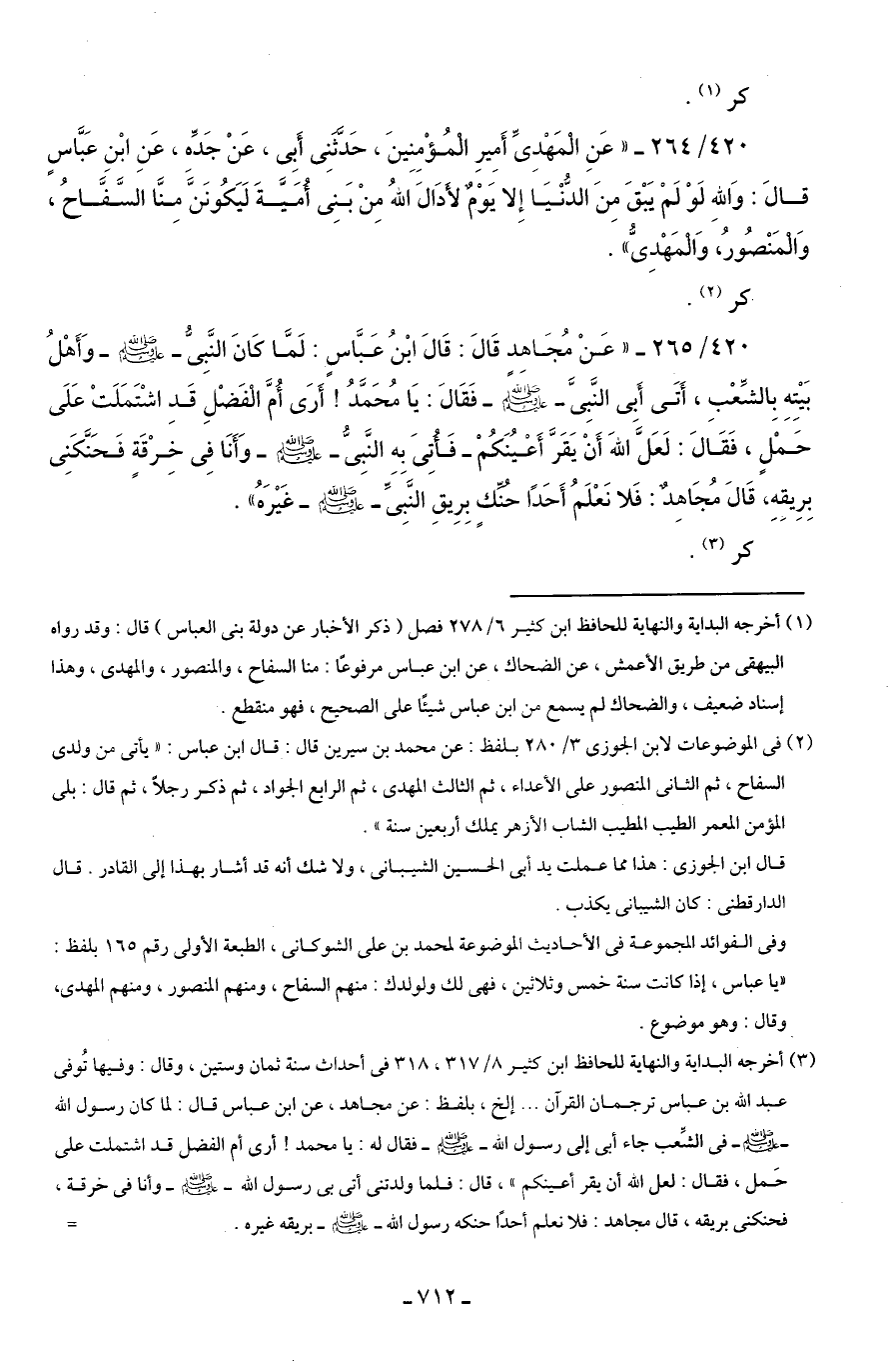 420/ 264 - "عَنِ الْمَهْدِىِّ أَمِيرِ الْمُؤْمِنِينَ، حَدَّثنِى أَبِى، عَنْ جَدِّه، عَنِ ابْنِ عَبَّاسٍ قالَ: وَاللهِ لَوْ لَمْ يَبْقَ مِنَ الدُّنْيَا إِلا يَوْمٌ لأدَالَ الله مِنْ بَنِى أُمَيَّةَ لَيَكُونَنَّ مِنَّا السَّفَّاحُ، وَالْمَنْصُورُ، وَالْمَهْدِىُّ".