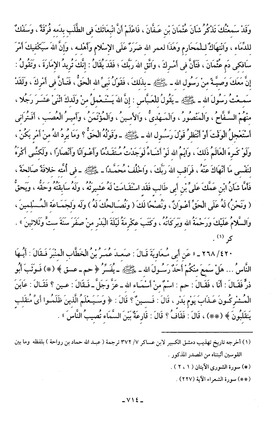 420/ 268 - "عَنِ أَبِى مُعَاوِيَةَ قَالَ: صَعِدَ عُمَرُ بْنُ الْخَطَّابِ الْمنْبَرَ فَقَالَ: أَيُّهَا النَّاسُ ... هَلْ سَمِعَ مِنْكُمْ أَحَدٌ رَسُولَ اللهِ - صلى الله عليه وسلم - يُفَسِّرُ {حم - عسق} (*) فَوَثَبَ أَبُو ذرٍّ فَقَالَ: أَنَا، فَقَالَ: حم: اسْمٌ مِنْ أَسْمَاءِ اللهِ - عَزَ وَجَلَّ - فَقَالَ: عين؟ فَقَالَ: عَايَنَ الْمُشْرِكُونَ عَذَابَ يَوْمِ بَدْرٍ، قَالَ: فَسِينٌ؟ قَالَ: {وَسَيَعْلَمُ الَّذِينَ ظَلَمُوا أَيَّ مُنْقَلَبٍ يَنْقَلِبُونَ} (* *)، قَالَ: فَقَافُ؟ قَالَ: قَارِعَةٌ بَيْنَ السَّمَاءِ تُصِيبُ النَّاسَ".
