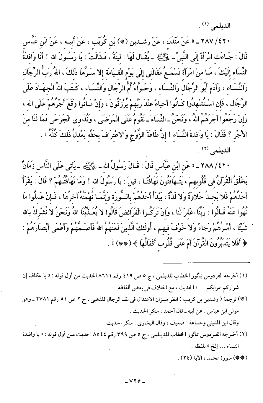 420/ 288 - "عَنِ ابْنِ عَبَّاسٍ قَالَ: قَالَ رَسُولُ اللهِ - صلى الله عليه وسلم - يَأتِى عَلَى النَّاسِ زَمَانٌ يَخْلَقُ القُرآنُ فِى قُلُوبِهِمْ، يَتَهَافَتُونَ تَهَافُتًا، قِيلَ: يَا رَسُولَ اللهِ! وَمَا تَهَافُتُهُمْ؟ قَالَ: يَقْرَأُ أَحَدُهُمْ فَلا يَجِدُ حَلاوَةً وَلا لَذَّةً، يَبْدَأُ أَحَدُهُمْ بالسُّورَةِ وَإنَّمَا نُهْمَتُهُ آخِرُهَا، فَإِنْ عَمِلُوا مَا نُهُوا عَنْهُ قَالُوا: رَبَّنَا اغْفِرْ لَنَا، وَإِنْ تَرَكُوا الفَرَائِضَ قَالُوا لا يُعَذِّبُنَا الله وَنَحْنُ لا نُشْرِكُ بالله شَيْئًا، أَمْرُهُمْ رَجاءٌ وَلا خَوْفَ فِيهِم، أُولَئِكَ الَّذِينَ لَعَنَهُمُ الله فَأَصَمَّهُمْ وَأَعْمَى أَبْصَارَهُمْ: {أَفَلَا يَتَدَبَّرُونَ القُرْآنَ أَمْ عَلَى قُلُوبٍ أَقْفَالُهَا} (* *) ".