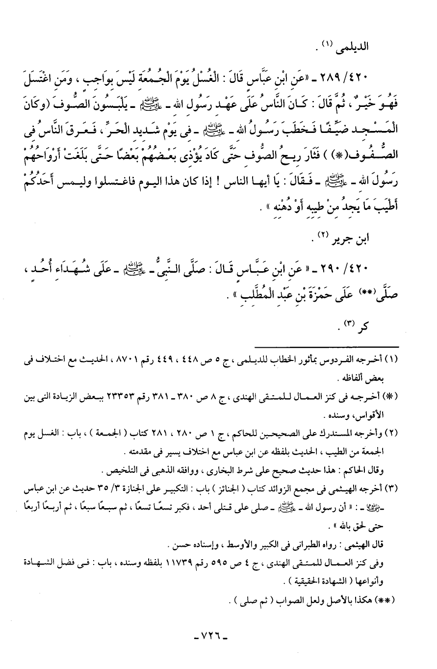 420/ 290 - "عَنِ ابْنِ عَبَّاسٍ قَالَ: صَلَّى النَّبِىُّ - صلى الله عليه وسلم - عَلَى شُهَدَاءِ أُحُدٍ، صَلَّى (* *) عَلَى حَمْزَةَ بْنِ عَبْدِ المُطَّلِب".